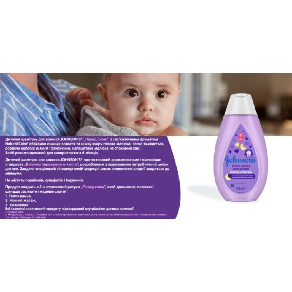 Наш дитячий шампунь з ароматом NaturalCalm допомагає малюкові з 6 місяців розслабитися перед сном. Засіб легко змивається, роблячи волосся малюка м'яким і блискучим, залишаючи чудовий свіжий аромат. Розслаблюючий аромат NaturalCalm заспокоює малюка перед сном.