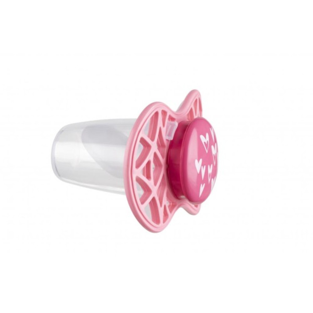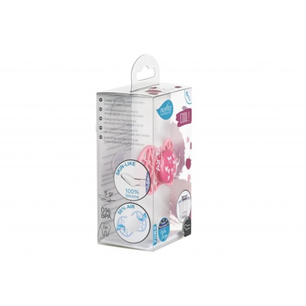 Пустушка ортодонтична Nuvita NV7084 Air55 Cool 6m + "сердечка" рожева. Пластина соски на 55% складається з повітря забезпечуючи майже повну аерацію області навколо рота, уникаючи скупчення слини, яка може подразнювати шкіру. Захисний ковпачок для соски для підтримки чистоти соски і стерилізації в мікрохвильовій печі простим додаванням води.