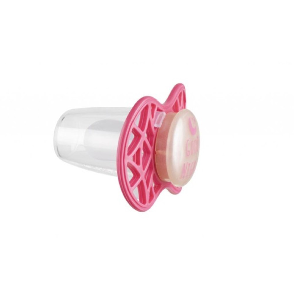 Симетрична пустушка Air55 Cool, яка світиться в темряві. Платівка соски на 55% складається з повітря забезпечуючи майже повну аерацію області навколо рота, уникаючи скупчення слини, яка може дратувати шкіру. Захисний ковпачок для соски для підтримки чистоти соски і стерилізації в мікрохвильовій печі простим додаванням води.