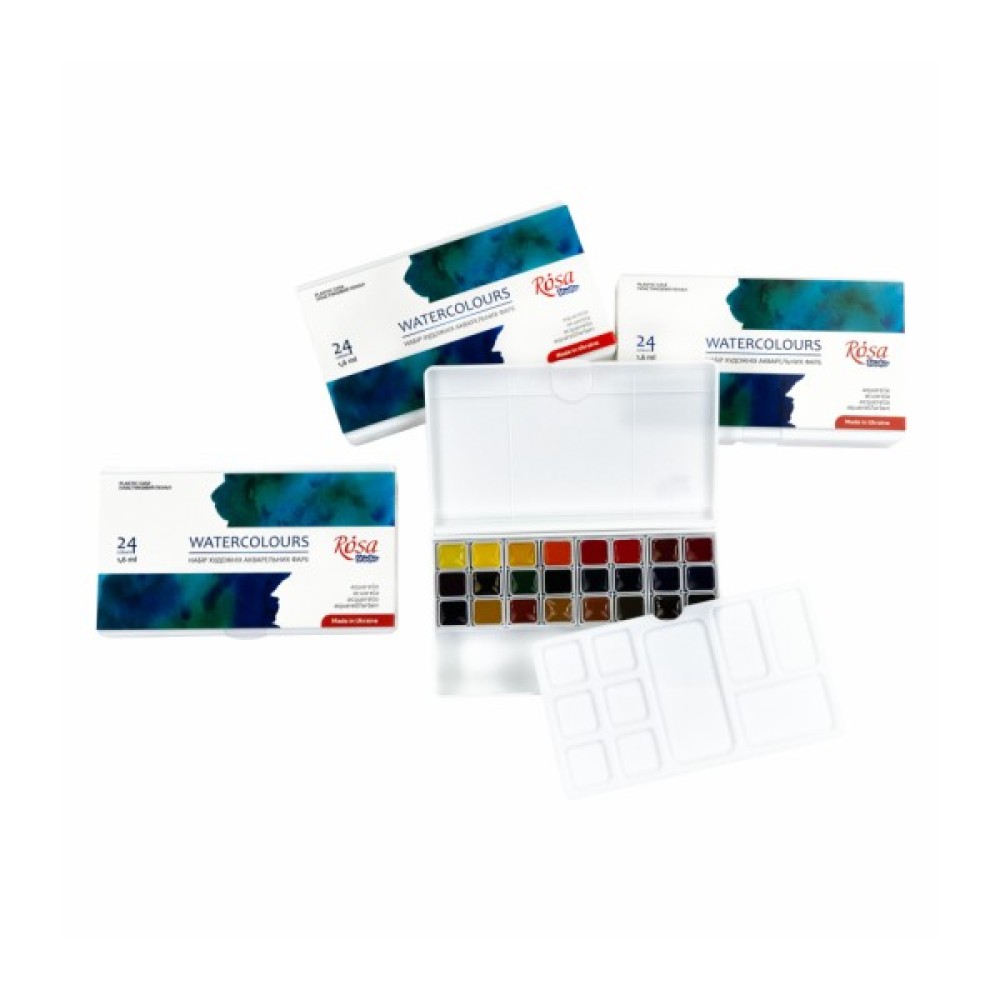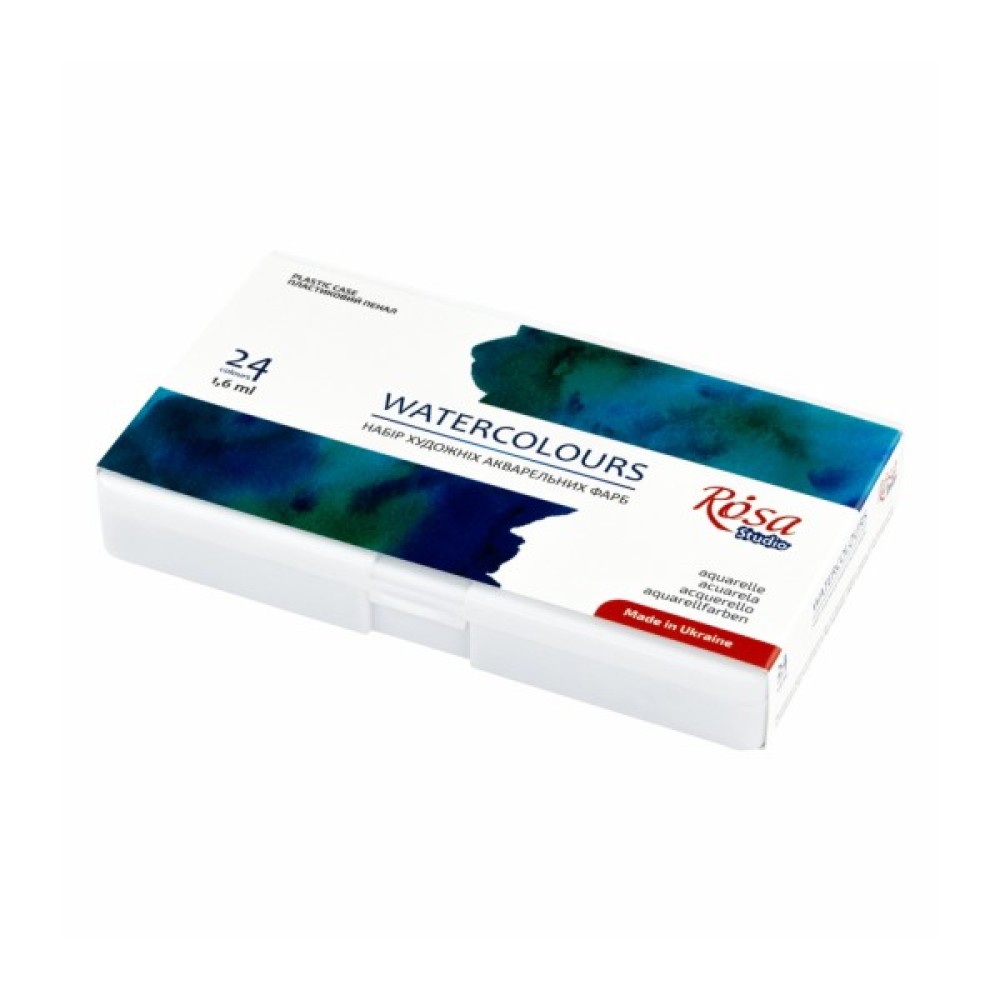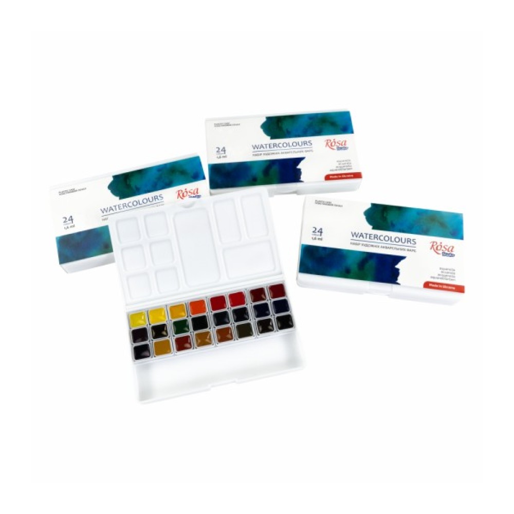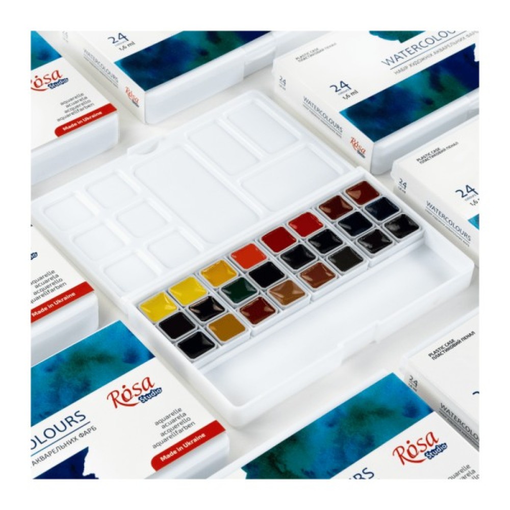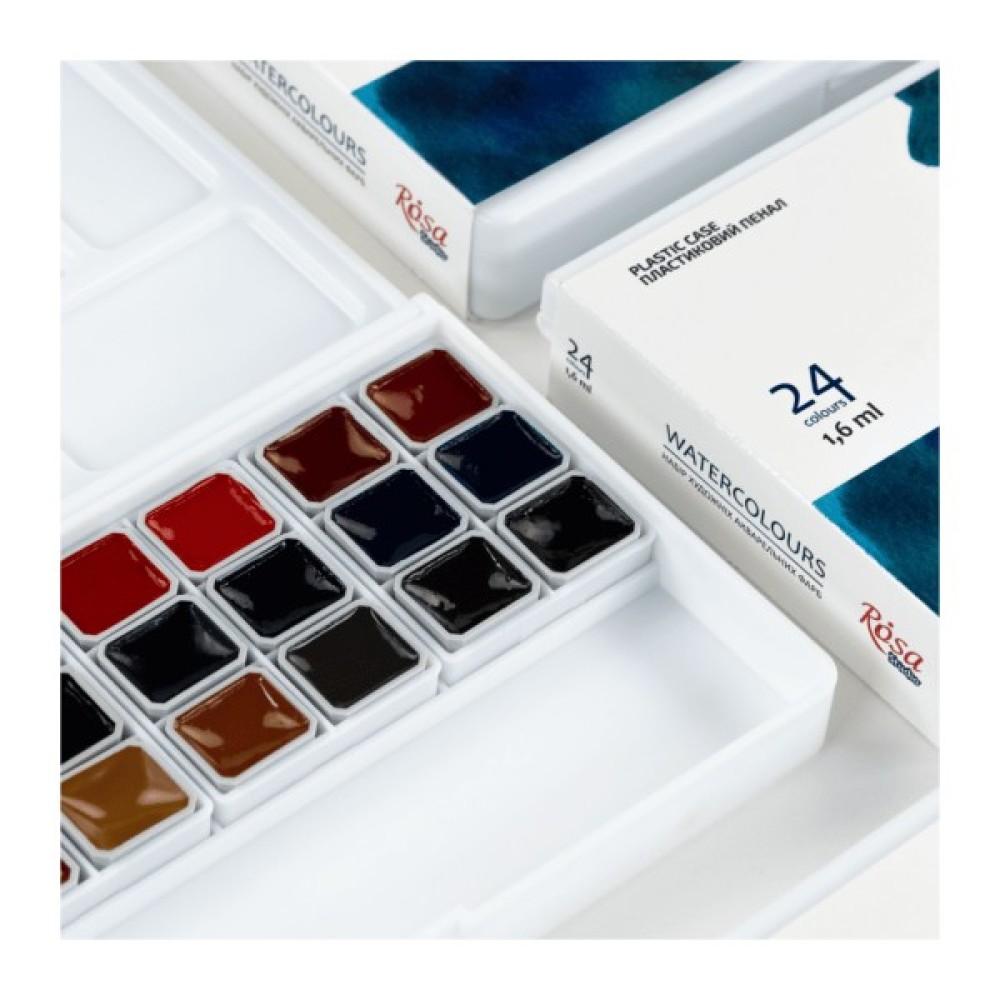 Набір акварельних фарб ROSA Studio на 24 кольори в півкюветах та пластиковому пеналі.Набір акварелі ROSA Studio - це ідеальне рішення для художників, які опановують акварель та студентів художніх навчальних закладів:- Півкювети об'ємом 1,6 мл мають оптимальну кількість фарби для курсу навчання. - 24 кольори акварелі, підібрані згідно з методологією живопису;- Легкий, зручний та компактний пластиковий пенал з додатковою палітрою дозволяє зручно переносити фарби в сумці.Акварельні фарби в пластиковому пеналі — вдалий подарунок для студента-художника!Пластиковий пенал з акварельними фарбами ROSA Studio має свої вигоди й переваги: - Виготовлений з приємного на дотик, якісного білого пластику, з кришкою палітрою та додатковою палітрою з лунками всередині, яку при потребі можна дістати з пенала.- На палітрах легко працювати зі змішуваннями, фарби не збираються краплинками та гарно відображають колір замісу. - Пенал має спеціальне відділення для гумки, олівця або пензля з короткою ручкою.- Завдяки невеликому розміру пенала, його комфортно тримати у руці в процесі роботи.- Акварель в легкому та компактний пластиковому пеналі зручно переносити та брати з собою на заняття, скетчінг, пленер. Щоразу після закінчення роботи переконайтесь, що в пеналі немає зайвої вологи перед тим як класти в багаж, аби запобігти витоку рідкої фарби з лунок.Художні акварельні фарби ROSA Studio створені для навчання та розвитку акварельної майстерності. Виготовлені з якісних пігментів та унікального спеціального в’яжучого, що містить гуміарабік, фарби відповідають усім вимогам акварельного живопису.Набір акварельних фарб ROSA Studio на 24 пів кювети сформовані з традиційних для акварельної техніки кольорів. Шляхом їх змішування можна легко отримати нові потрібні кольори та відтінки. Якісні пігменти забезпечують насиченість, чистоту та прозорість кольорів. В'яжуче на натуральній рослинній основі з вмістом гуміарабіку дозволяє досягнути відмінного рознесення фарб по поверхні.Класична технологія природного сушіння акварелі забезпечує її легке розчинення водою та набір фарби на пензель. Більшість фарб у наборі є одно пігментними, що дає безліч можливостей для експериментів з сумішами.Після висихання фарби утворюють матовий кольоровий шар, що додає роботам вишуканості та атмосферності.Властивості нових наборів акварельних фарб ROSA Studio:- Півкювет об'ємом 1,6 мл достатньо для курсу навчання;- Компактний пластиковий пенал зручно переносити в сумці;- 24 базові кольори при змішуванні дають широку колірну гаму;- Якісні тонко терті пігменти, забезпечують класичну прозорість акварелі;- Широкий діапазон кольору від насиченого в щільному шарі до світлопрозорого при розведенні;- Виготовлені на основі гуміарабіку – еластичні після висихання.