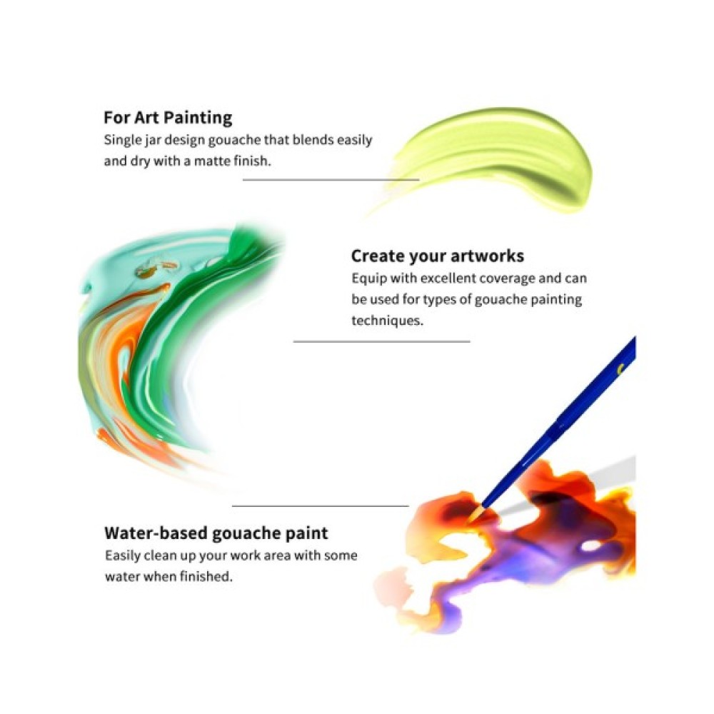 Удосконалено формулу фарби Arrtx, у цій гуаші менше клею, чистіші пігменти, більш насичені кольори, менше запаху. Коли картина висохне, вона не потріскається, а фарби залишаться яскравими і не потьмяніють довгий час.
