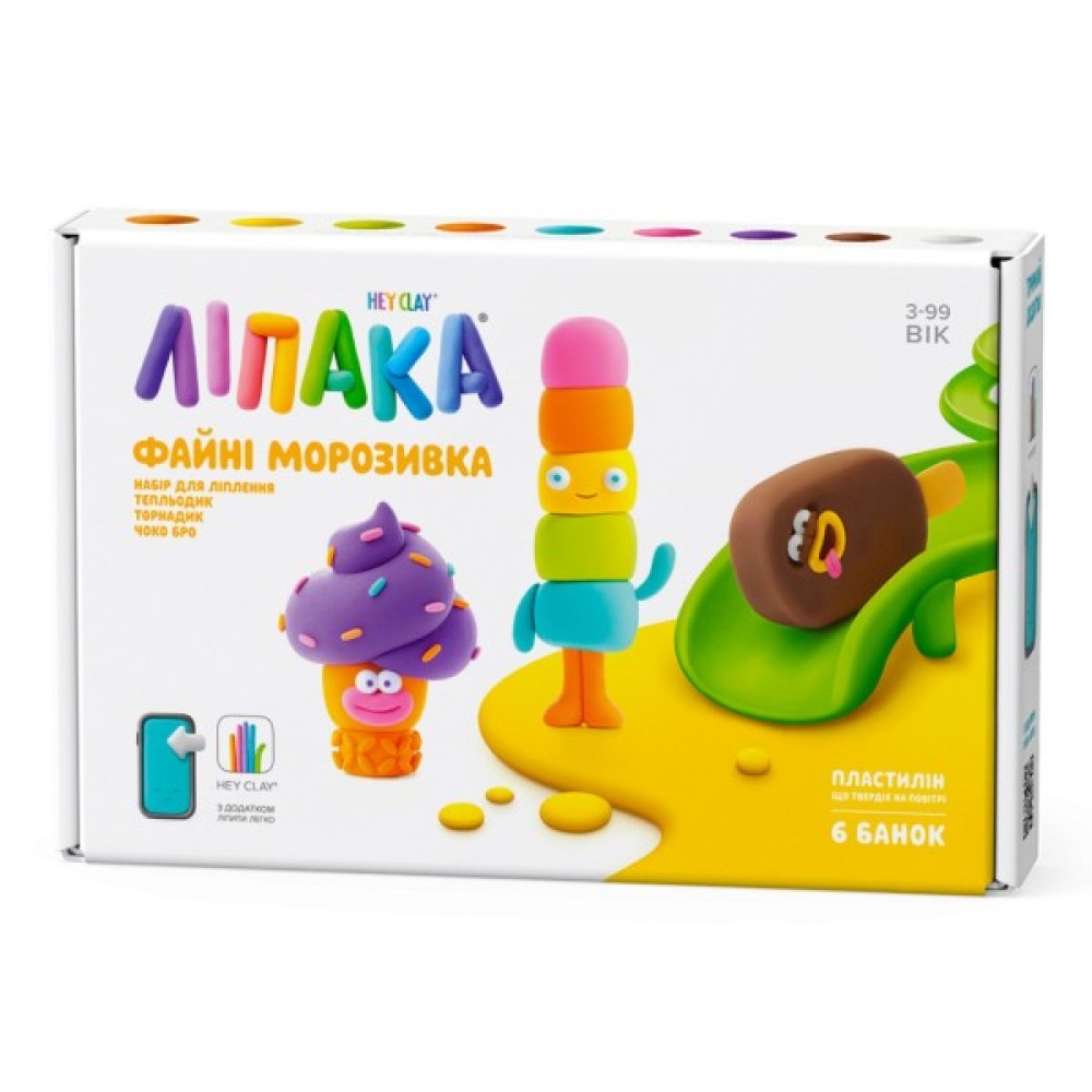 Набір пластиліну, що самостійно твердіє, ЛІПАКА – ФАЙНІ МОРОЗИВКА: ТЕПЛЬОДИК, ТОРНАДИК, ЧОКО БРО – розважить і малюків, і дорослих. За допомогою анімаційних інструкцій в додатку HEY CLAY, Ви зможете зліпити трьох кумедних героїв. Пластилін твердіє на повітрі протягом 24 годин, після чого можна гратися створеними фігурками.