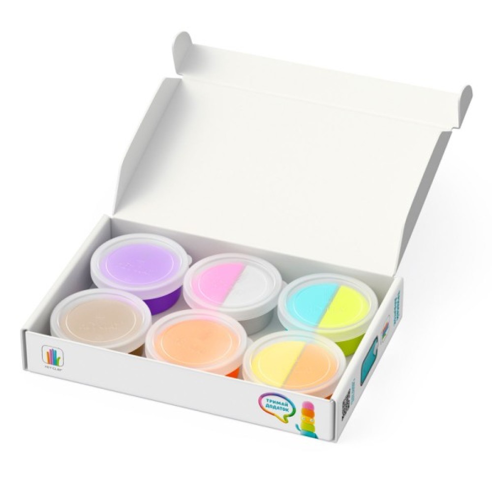 - В набір може входити до 9 різних кольорів (баночка може містити пластилін двох різних кольорів).