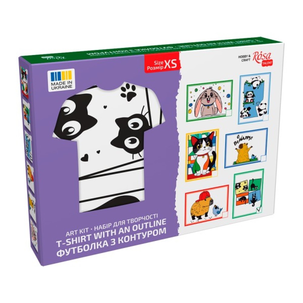 футболка з нанесеним контуром малюнку. матеріал: 100% бавовна. розмір xs (44х59 см). колір: білий.акрилові фарби для розпису тканин rosa talent. пензель художній. кольорова схема. прозорий пакет.