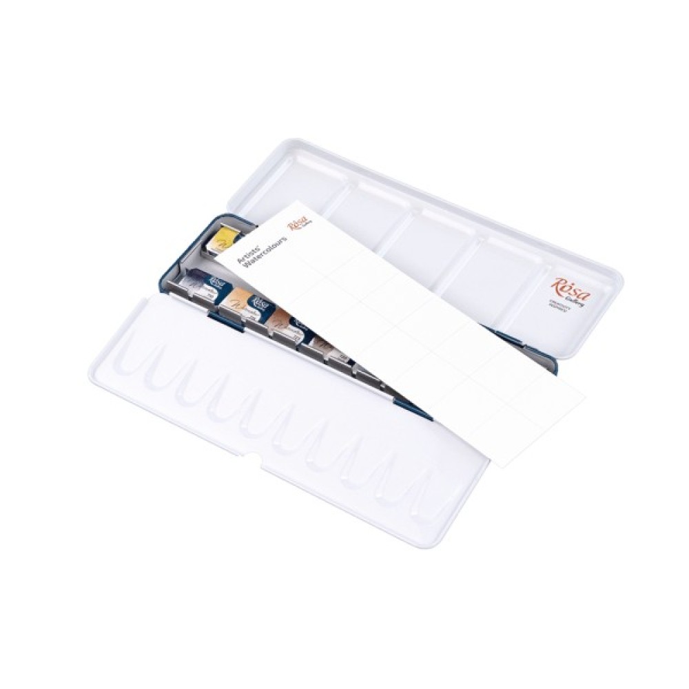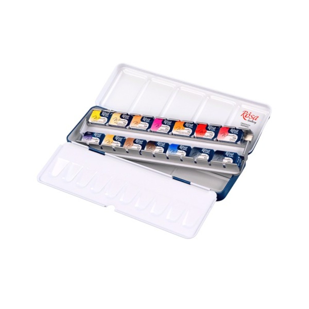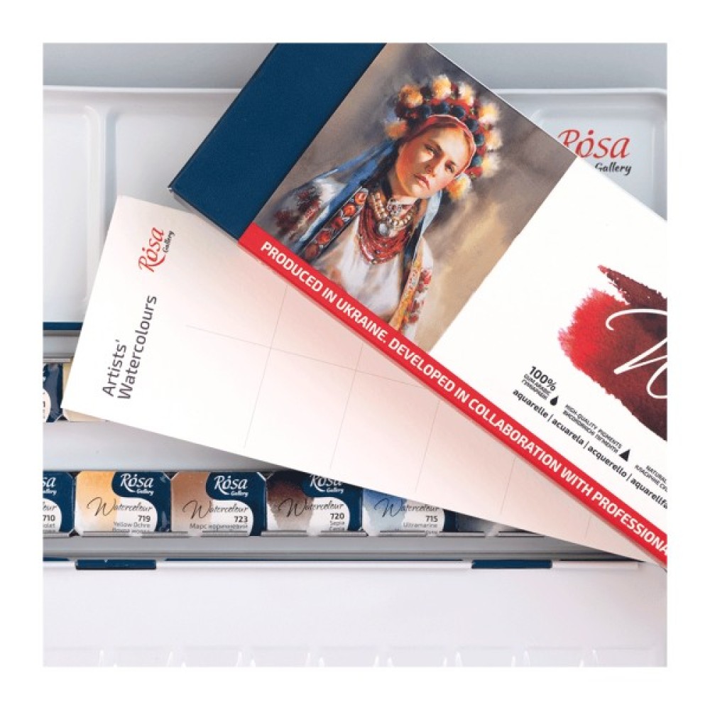 Завдяки стильному дизайну обгортки та металевому пеналу з кришкою-палітрою набори акварельних фарб ROSA Gallery в кюветах стануть вишуканим подарунком для професійного художника