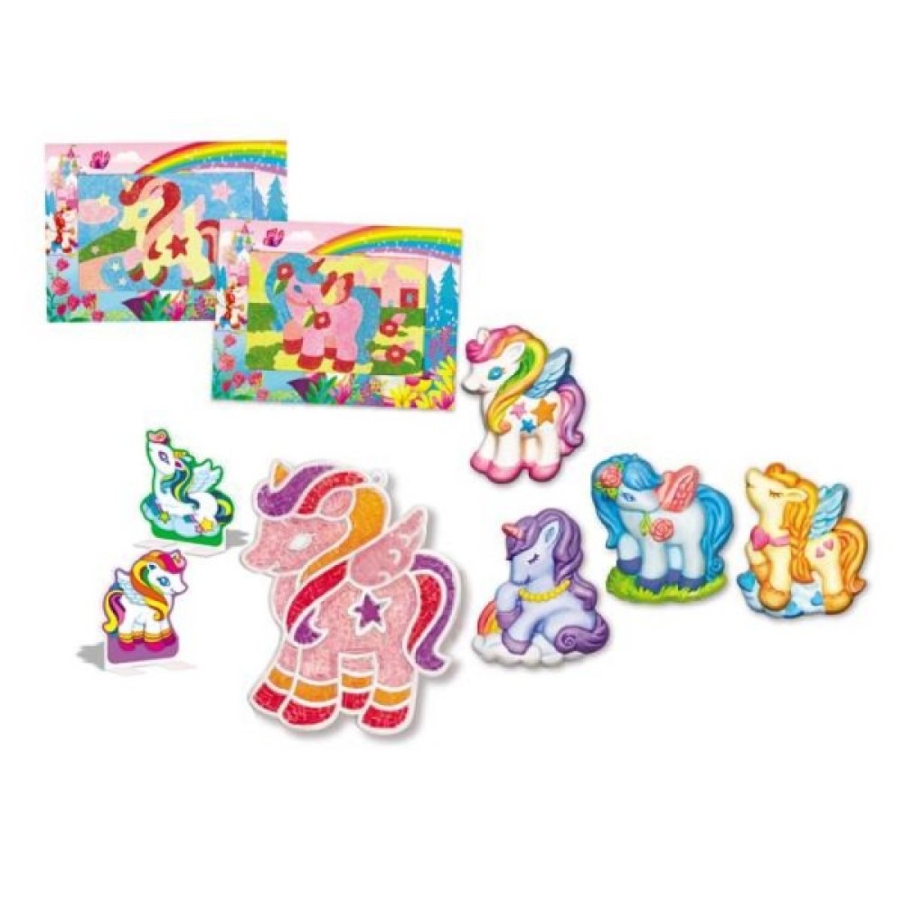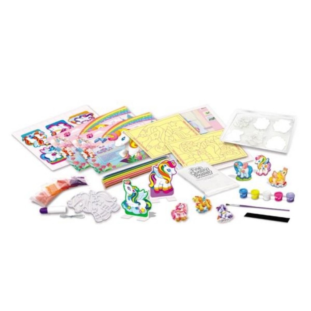 КОМПЛЕКТАЦІЯ: 1 шаблон із 6 формами, 1 пакет із гіпсовим порошком, 1 прогумована магнітна смужка, 6 фарб, 1 пензель, 2 заготовки для пісочних картин із клейкою основою, 2 рами для картин, 6 трубочок із кольоровим блискучим піском, 1 прозора заготовка для вітража, 4 упаковки різнокольорового бісеру, 1 тюбик клею, моток ниток, шаблон із 6 картками єдинорогів, докладна інструкція.