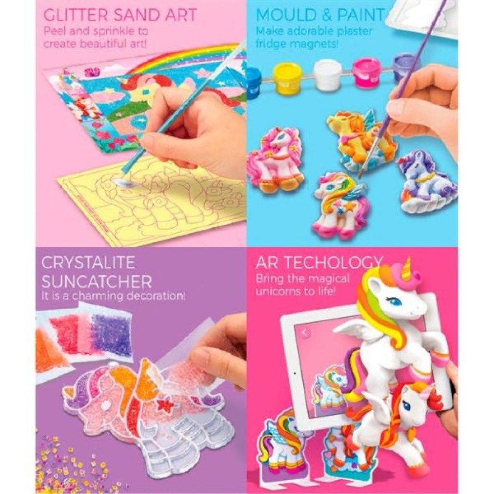 Створіть свою чарівну країну єдинорогів із цим великим набором для творчості від 4M. Завдяки комплекту можна зробити і розфарбувати 6 магнітів, 2 картини з піску і вітраж із бісеру, щоб прикрасити вікно. Додається інструкція з детальним описом занять і малюнками.
