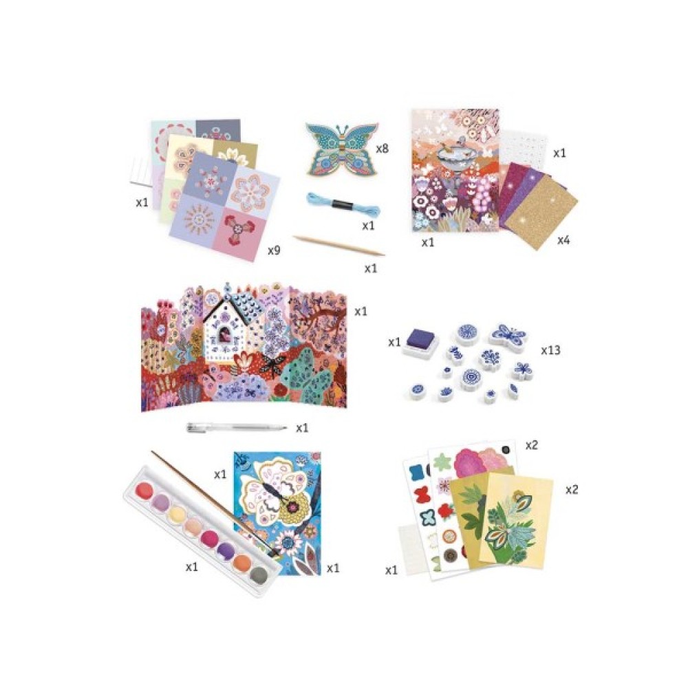Комплектація 13 штампів, Подушечка для чорнила, Ручка для штампів, Велика основа для малювання, 8 кольорів фарби, Пензлик, Основа для аплікації, 2 основи для колажів, 9 форм для 3Д квітів, 8 метеликів для гірлянди Нитка
