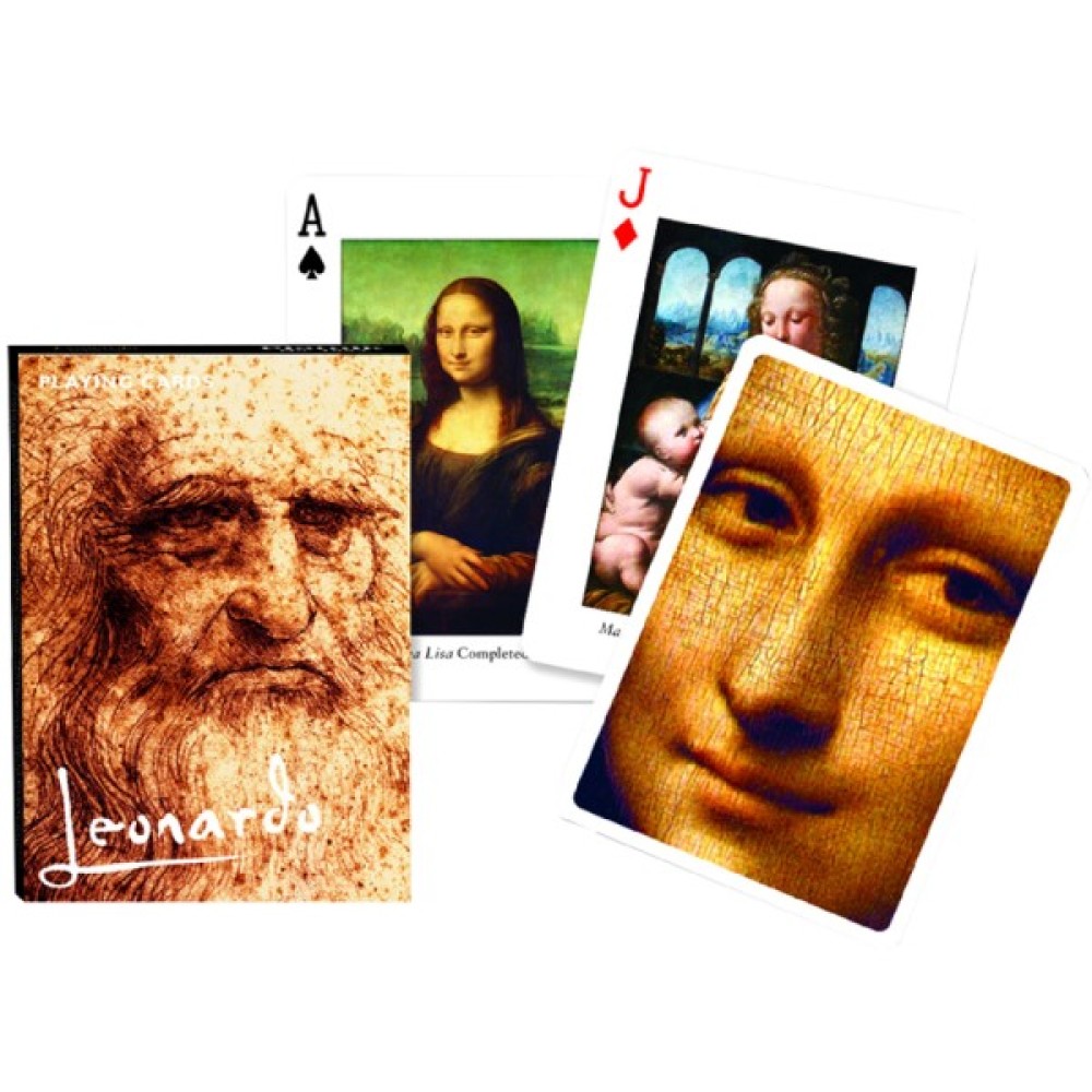 Гральні карти Леонардо - на зовнішньому та зворотньому боці зображені репродукції картин видатного італійського митця Високого Відродження. Карти виготовлені з високоякісного картону з ламінуванням. Ламінування покращує ковзання та довговічність карт. Чудово підходять для аматорської гри. Розмір карт стандартний, вони ідеально підходять для будь-яких карткових ігор. Колода складається з 52 основних карт, 2-х джокерів та промокарти.