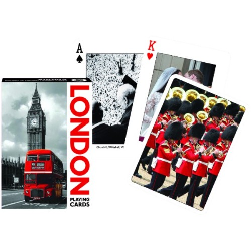 Гральні карти Лондон - на зовнішньому та зворотньому боці зображення, які без сумніву асоціюються з цим містом. Карти виготовлені з високоякісного картону з ламінуванням. Ламінування покращує ковзання та довговічність карт. Чудово підходять для аматорської гри. Розмір карт стандартний, вони ідеально підходять для будь-яких карткових ігор. Колода складається з 52 основних карт, 2-х джокерів та промокарти.