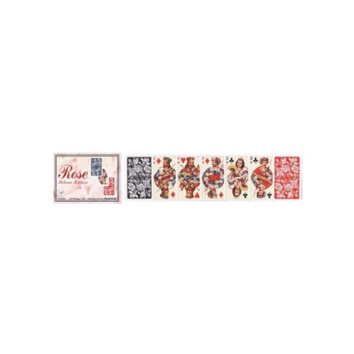 Сувенірний набір - Троянда, відмінний комплект для шанувальників пасьянсів. Карти виготовлені з високоякісного картону з ламінуванням. Ламінування покращує ковзання та довговічність карт. Сорочка може бути в червоних та синіх кольорах з білими трояндами. Кожна колода складається з 52 основних карт, 2-х джокерів та промокарти. Розмір карт 66х44 мм.
