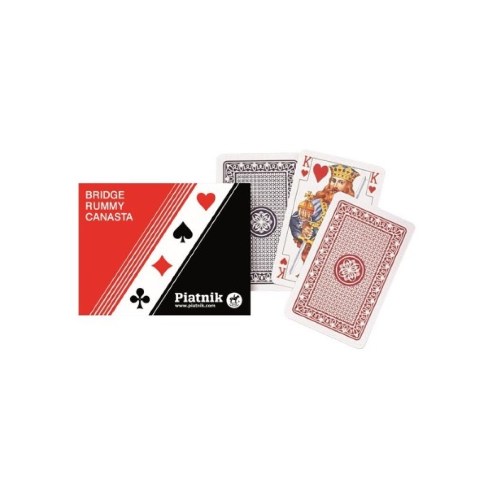 Гральні карти Руммі - набір з 2-х колод, можна використовувати для будь-яких карткових ігор але ідеально підійде для гри у бридж, руммі, каната. Карти виготовлені з високоякісного картону з ламінуванням. Ламінування покращує ковзання та довговічність карт. Сорочка може бути в червоному або синьому кольорі. Розмір карт стандартний, вони ідеально підходять для будь-яких карткових ігор. Колода складається з 52 основних карт, 2-х джокерів та промокарти.
