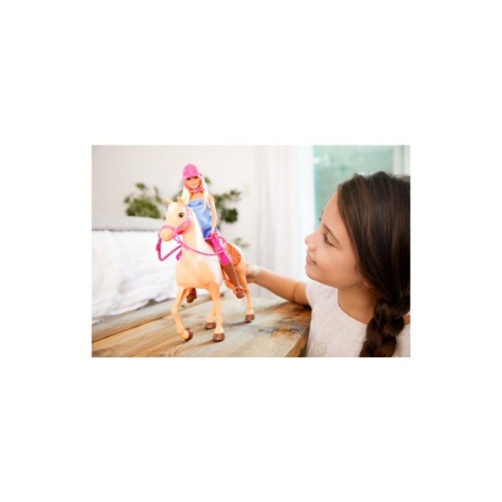 Ігровий набір Верхова їзда від бренду Barbie надасть дитині можливість провести час весело і з користю. Лялька одягнена в блакитний топ в горошок і високі чоботи на шнурівці. Коліна згинаються, що дозволяє посадити Барбі на коня. Кінь пісочного кольору і прикрашений рожевою знімною вуздечкою, а також сідлом. Щоб вирушити в захопливу подорож, досить надіти шолом і посадити Барбі на коня.