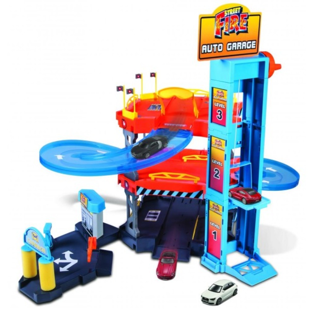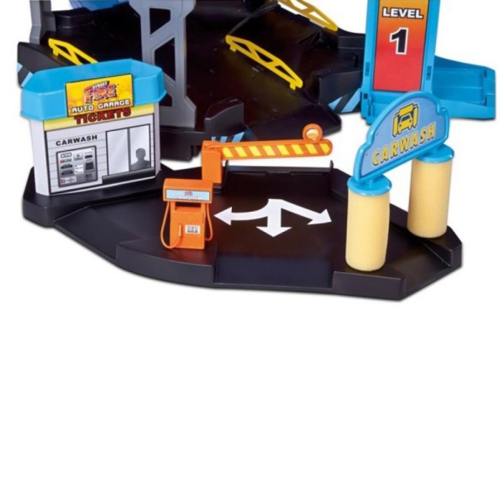 Паркінг з трьох рівнів з автотрасою, цікавими круговими спусками, автозаправною станцією, підйомним ліфтом на другий і третій поверхи, два автомобіля в масштабі 1:43.