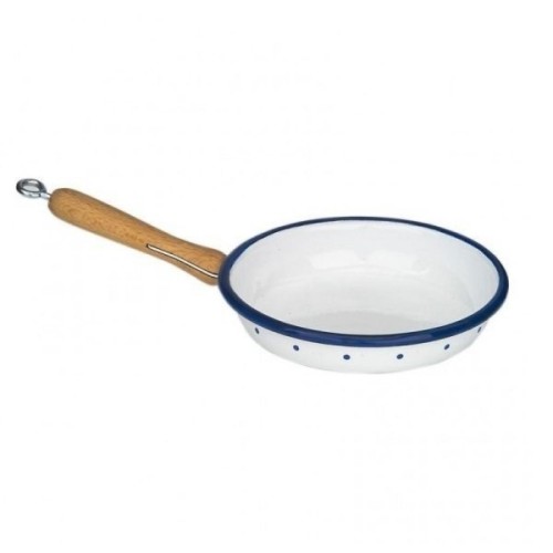 Іграшкова сковорідка виглядає зовсім як справжня. Виготовлена з безпечного матеріалу, з використанням нетоксичних фарб. Сковорідка білого кольору, з візерунком у цятку і обідком синього кольору. Виріб – емальований, з дерев’яною ручкою. Діаметр посуду – 12 см. За дерев’яну ручку зручно тримати. Для дітей від 3-ох років. Виробник – німецький бренд іграшок nic.