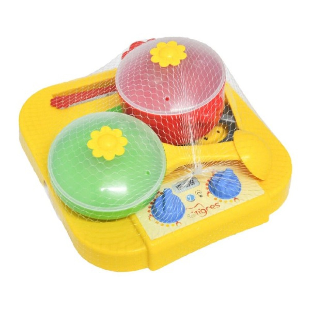 Набір іграшкового посуду столовий «Ромашка» з плитою 7 елементів від українського виробника Тигрес виготовлений з безпечного міцної  харчової пластмаси і підходить для використання в мікрохвильовій печі і посудомийній машині.