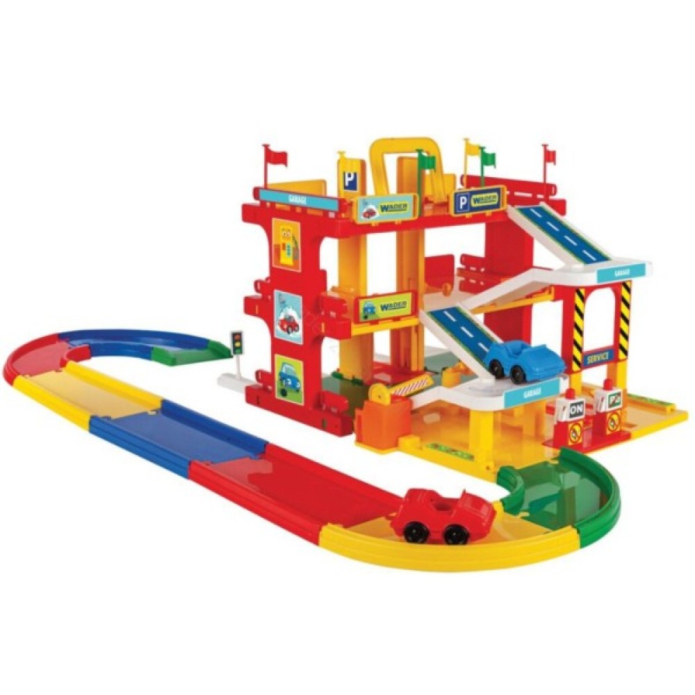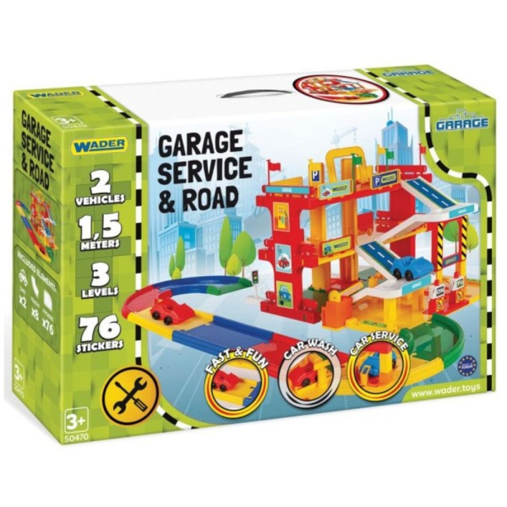 Гараж Wader "Сервіс" з дорогою - чудова іграшка для кожного маленького автолюбителя. Сучасний, реалістичний гараж обладнаний ліфтом, що перевозить автомобілі на потрібний поверх, рампою, авто мийкою, автозаправкою, сервісом техобслуговування, численними декораціями і наклейками, 2 автомобілями та 1.5-метровою дорогою.