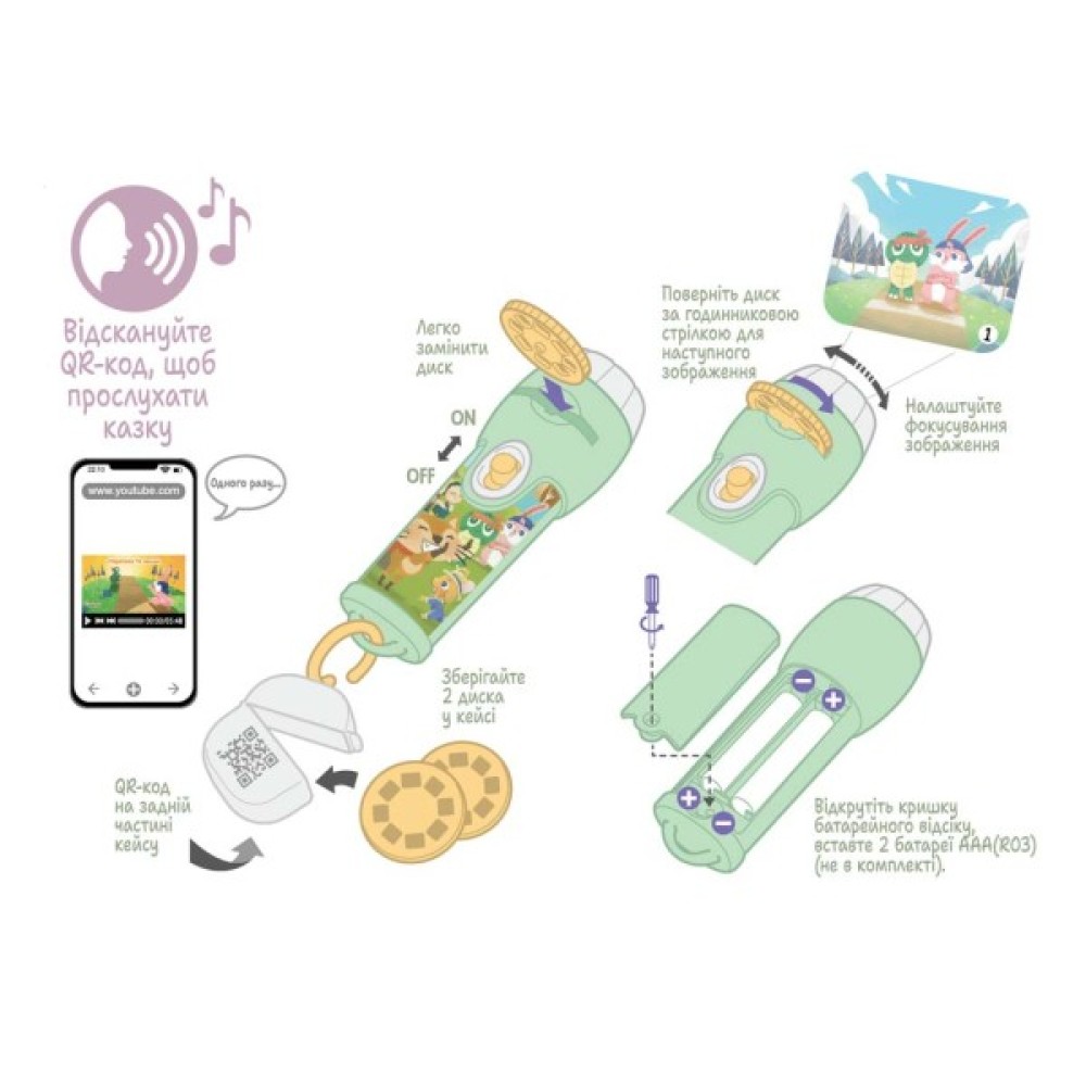Цей унікальний набір дозволить вам і вашим дітям поринути у захоплюючу пригоду та зустрітися з яскравими героями – розумною черепахою та швидким зайцем. Черепаха і заєць – це не просто аудіоказка, це справжнє диво і подив: Аудіоказка Черепаха та заєць оживить знайому історію, сповнену захоплюючих подій та уроків про терпіння та вміння працювати разом. Професійні актори нададуть кожному персонажу неповторний характер. Набір включає проектор, який створить чарівні ілюстрації на стінах або стелі кімнати, занурюючи вас у казковий світ. Працює від 2 батарейок ААА (не входять до комплекту) Слухаючи казку Черепаха та заєць, діти розвиватимуть свою креативність та уяву, уявляючи собі захоплюючі сцени та пригоди головних героїв. Набір виготовлений із безпечних та довговічних матеріалів, що забезпечує довгий термін служби та комфортне використання. Черепаха та заєць – це чудовий подарунок для дітей, який запам’ятається на довгі роки та принесе радість та задоволення. Вирушайте у захоплюючу подорож з аудіоказкою та проектором Черепаха та заєць! Замовте цей унікальний набір вже сьогодні та створіть незабутні моменти разом із вашими дітьми. Ця аудіоказка не тільки розважить і захопить, але й зробить ваше дозвілля сімейним і особливим, занурюючись у світ дружби та мудрих уроків, які залишаються з дітьми на все життя!
