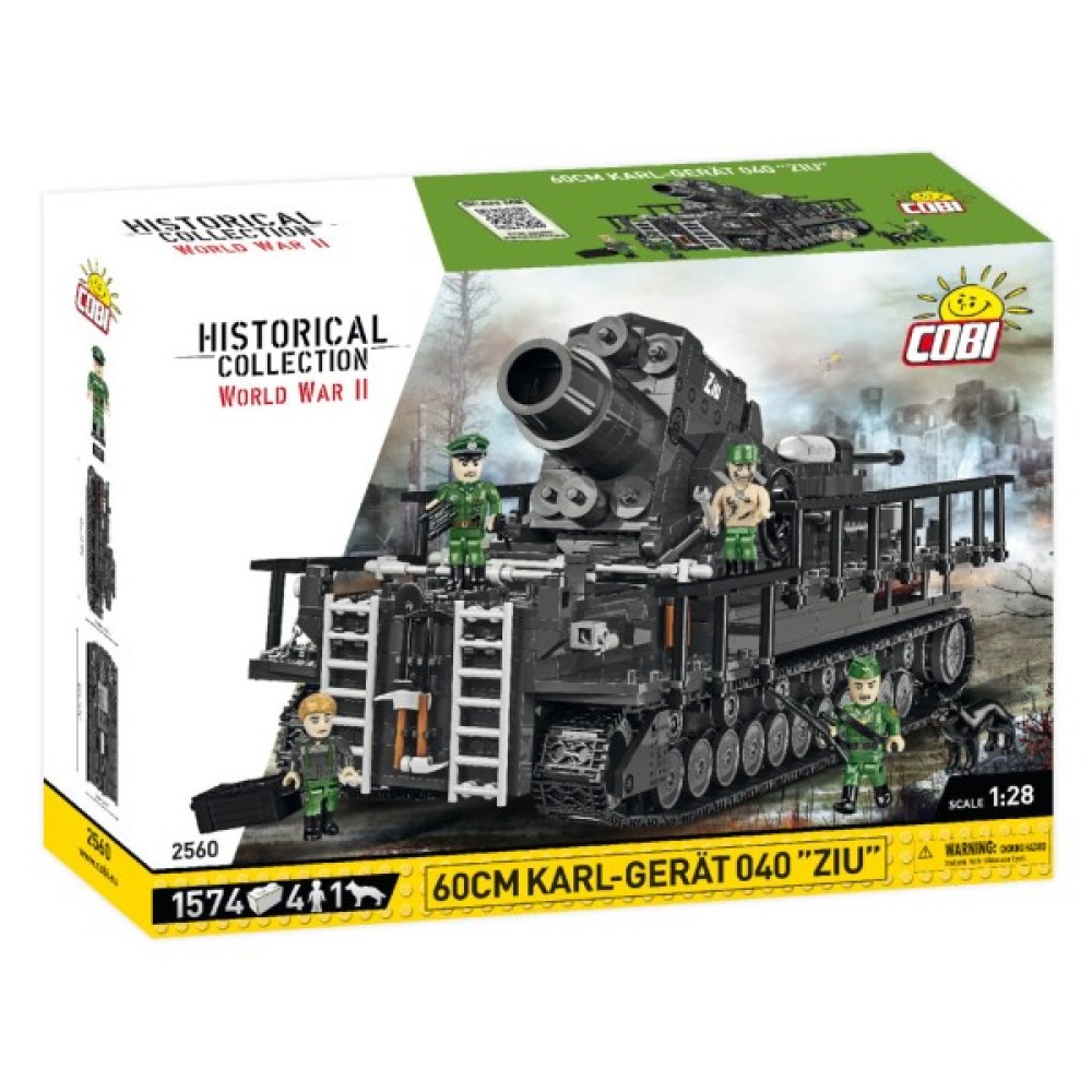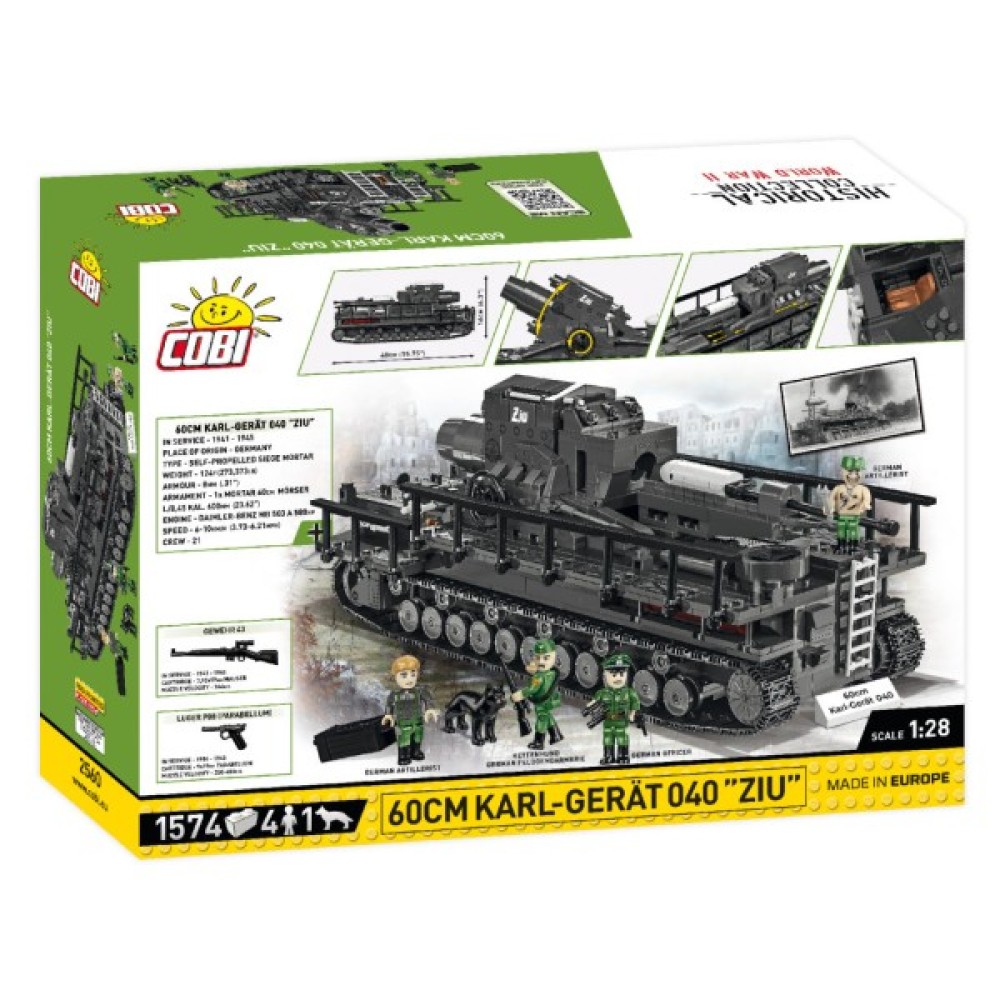Конструктор Cobi Самохідна мортира Карл 1:28, 1574 деталей (COBI-2560) — це вражаючий автоконструктор, що переносить вас у часи Другої світової війни. Станьте справжнім інженером, збираючи одну з найвідоміших самохідних артилерійських установок того періоду — мортира Karl-Gerät 040 з власним ім'ям "ZIU", відомою своєю участю в обстрілі Варшави 1944 року.