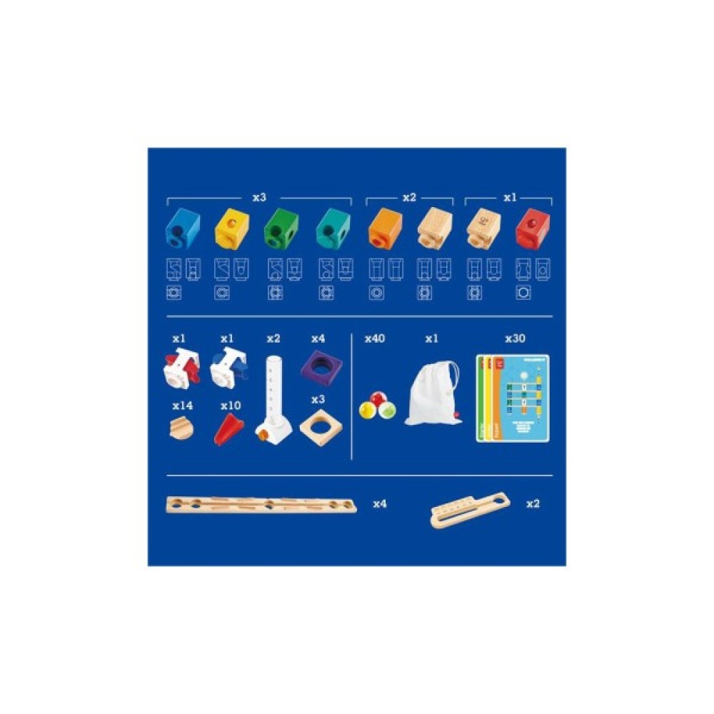 Комплект включає 40 різнокольорових кульок з бавовняним мішечком, а також ключові елементи, такі як 18 блоків, пристосування для подачі кульок, прискорювачі, кільця та тарілки для кульок. Крім того, 30 карток із завданнями забезпечують безмежні можливості для розвитку творчості та навичок вирішення завдань, допомагаючи вивчати основи програмування.