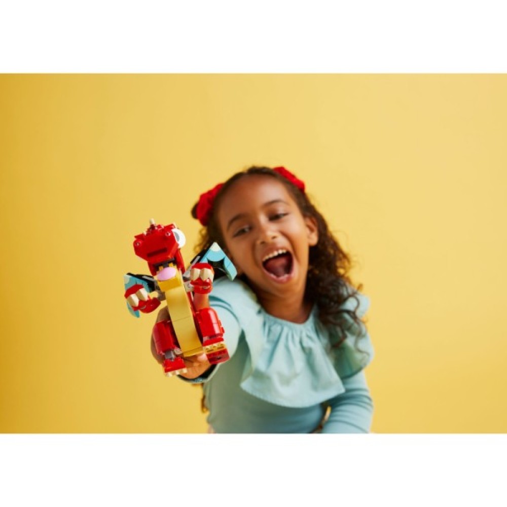 Основний герой цього набору — приязний червоний дракон, якого можна легко зібрати завдяки детально розробленим інструкціям. Дракон має великі очі, пазурі, рухомі лапи й крила, а також відкривається пащу, що відкриває необмежені можливості для пригод. Не менш цікаво, що одного разу зібраний дракон може бути швидко перетворений у величного фенікса з яскравим пір'ям або ж на граційну рибку з рухомими плавцями. Для творчих дітей цей набір пропонує безліч варіантів, адже, керуючись власною уявою, можна створювати навіть унікальні тваринки LEGO.