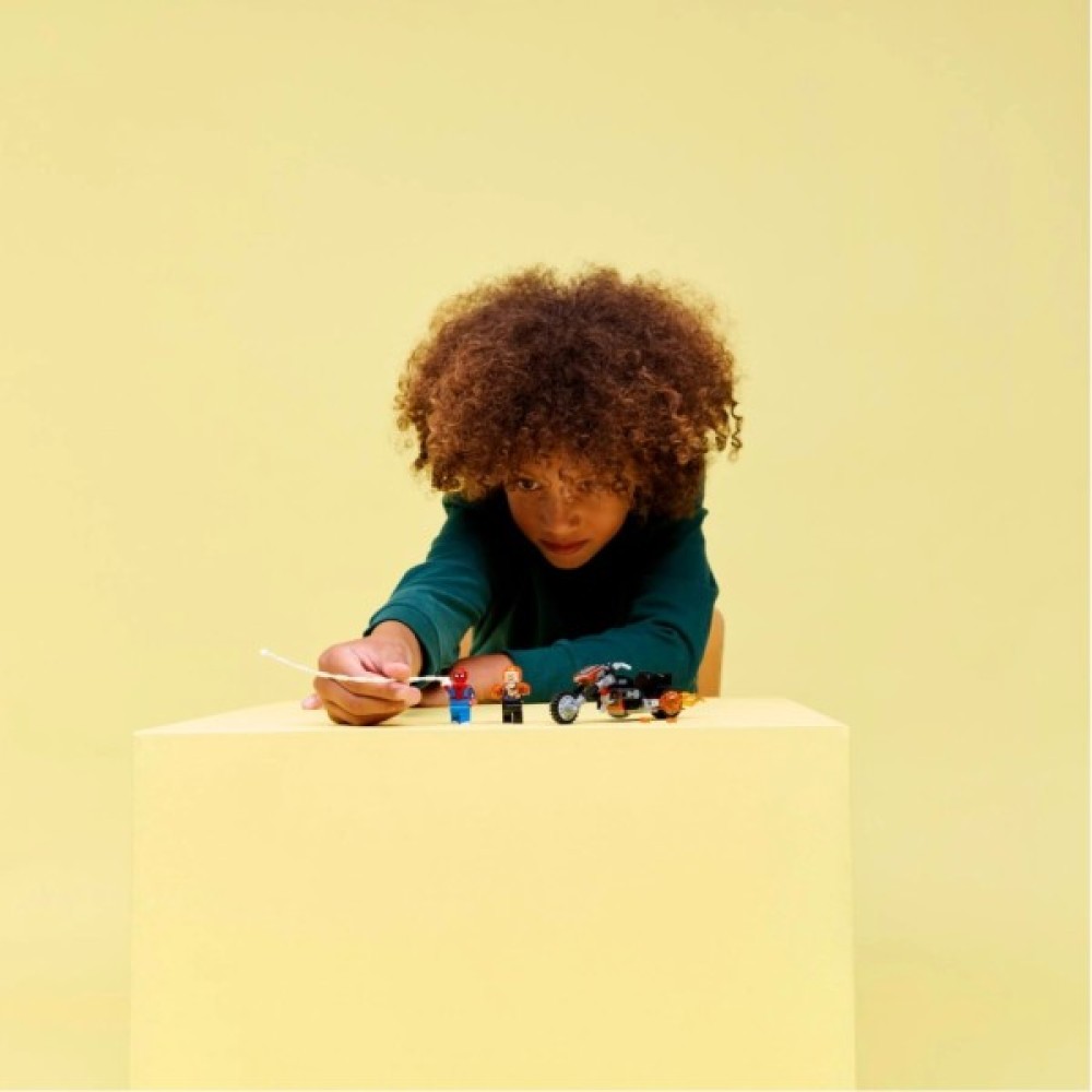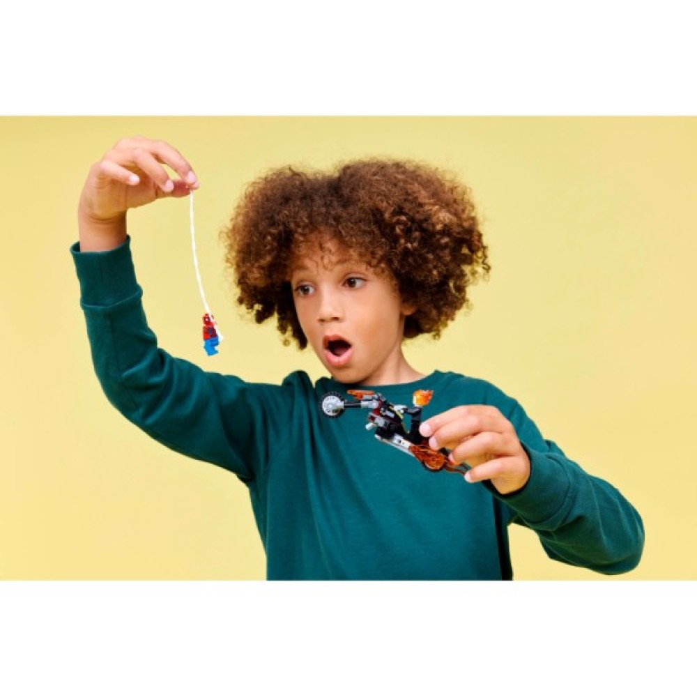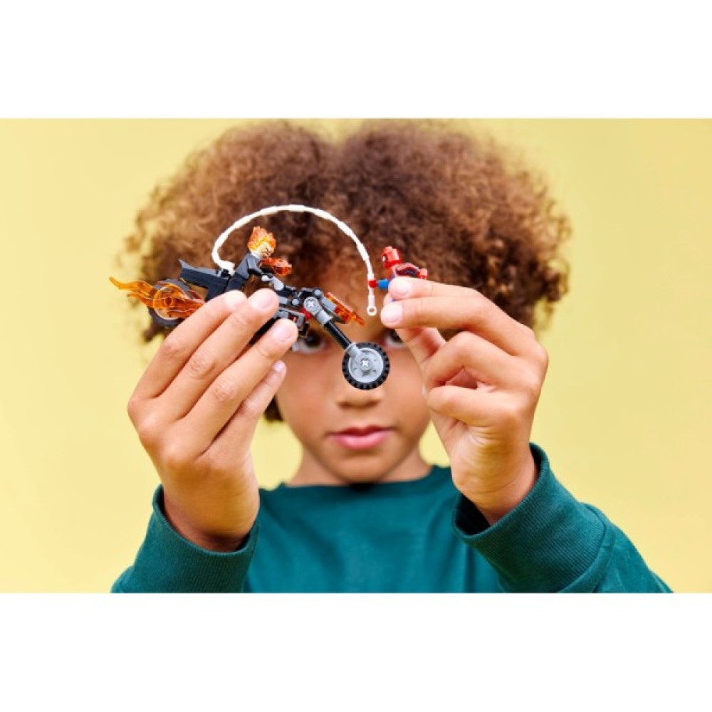 Цей набір серії LEGO Super Heroes веде у світ коміксів і дозволяє зібрати унікальні мініфігурки: нескореного Людину-павука та Примарного вершника у вогняних обладунках. Комплексні деталі та якісний пластик забезпечують міцну конструкцію, що витримає не один напад лиходія. Підключіть уяву дітей на повну, адже мотоцикл обладнаний двома полум'яними вихлопними трубами та шиповими шутерами.