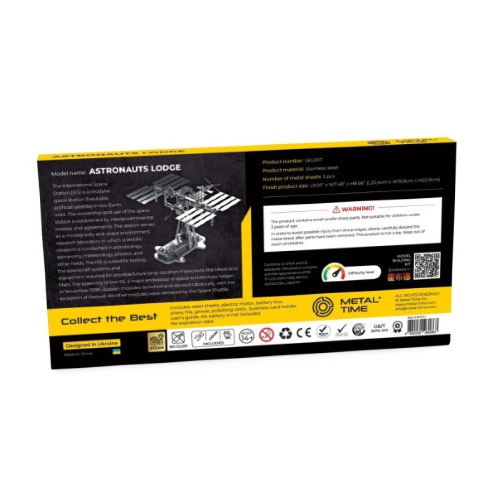 Крім сталевих деталей, до комплекту входять усі необхідні інструменти: мотор, акумуляторний блок, плоскогубці, напилок, монтажні рукавички, тканина для полірування, а також стильна шпилька та клубні аксесуари. Зберіть свій власний Astronaut's Lodge MT017 та доторкніться до космічної мрії прямо у себе вдома!