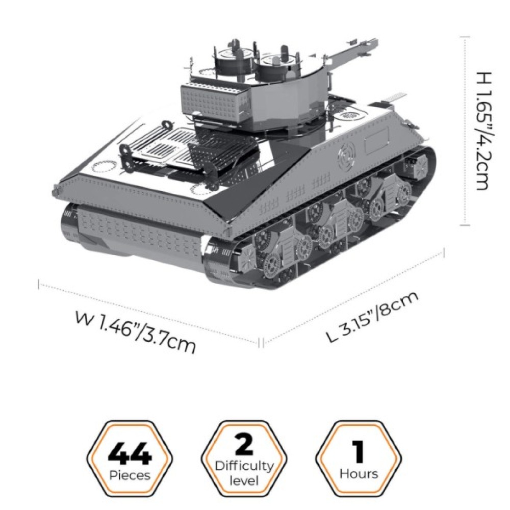 Виготовлений з міцного металу, конструктор складається з 44 деталей, що забезпечують максимальну деталізацію і реалістичний вигляд моделі. Розміри зібраного танка становлять 8.0х4.2х3.7 см, що дозволяє насолодитися усіма дрібницями цієї техніки в мініатюрі.