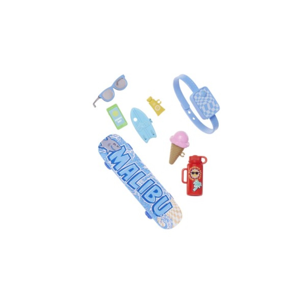 Комплектація кен, скейтборд для динамічних сюжетів, пляшка для води, сонцезахисний крем, телефон та серфбордний чохол для нього, сумка через плече, сонцезахисні окуляри, ріжок морозива