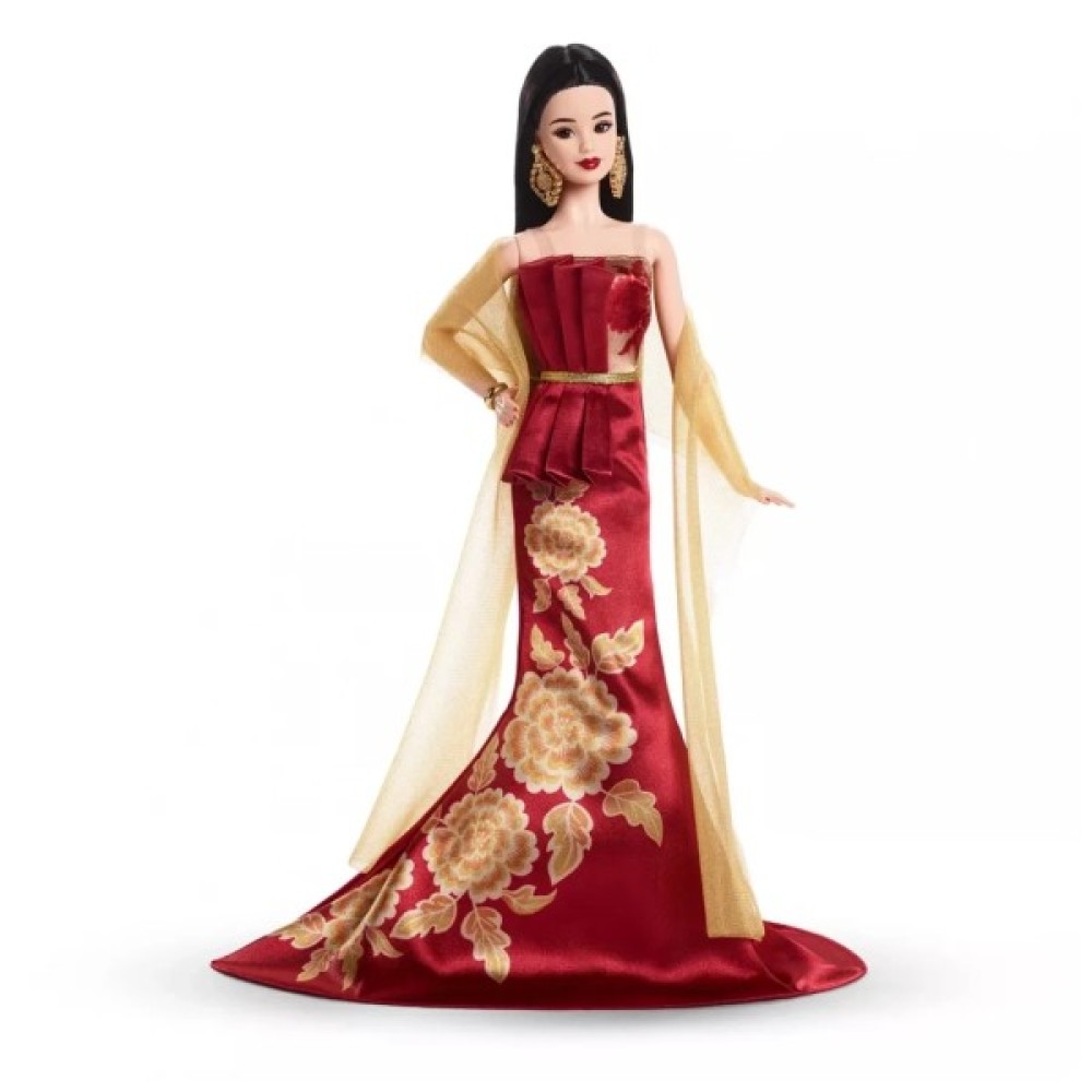 Колекційна лялька Barbie Signature Місячний Новий рік – це втілення витонченості та святкового настрою, створене спеціально для вшанування традицій східного календаря. Образ ляльки виконаний у насиченому червоному кольорі, який символізує удачу, радість і життєву енергію. Елегантна сукня з пишним силуетом та плісированим корсетом прикрашена золотистим принтом із зображенням півоній – квітів, що уособлюють достаток і гармонію, роблячи цю модель ідеальним символом побажань процвітання в новому році.