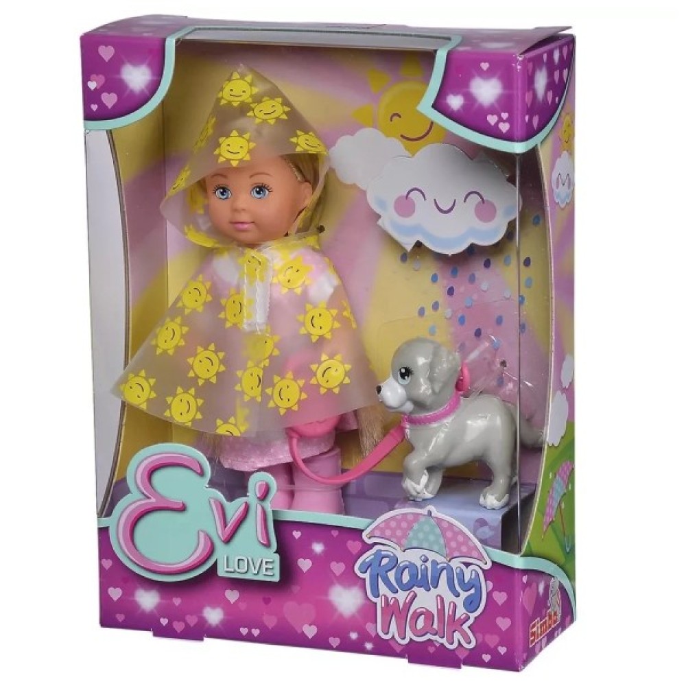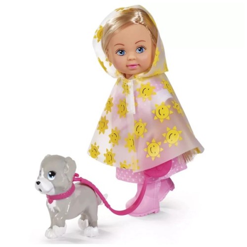 Маленька Еві любить тварин і має власного улюбленця сірого песика. Сьогодні вона вирушає на прогулянку з собачкою під час дощу, тому взяла свій прозорий дощовик прикрашений жовтими сонечками. Еві одягла літню рожеву сукню, взуття та доповнила свій образ дощовиком. Також Еві не забула про повідок для собачки.