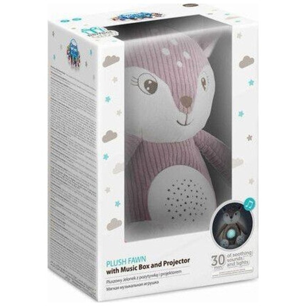 Оленятко з музичною шкатулкою та проектором є іграшкою 3в1. Це ідеальний друг для сну дитини. М’яка плюшева іграшка із механізмом, захованим у животику, на якому зображені різнокольорові зірочки та грають заспокійливі мелодії, заспокоїть малюка та допоможе йому заснути. Плюшева іграшка працює в 3 режимах. 1 режим - грає мелодія та випромінюються світлові проекції з животика, 2 режим – тільки грають мелодії, 3 режим роботи -  лише ніжні вогники, працюють таким чином, як нічник. Ви можете вибрати з 12 заспокійливих мелодій, включаючи ніжні звуки природи, спів птахів і серцебиття, а також є можливість встановити 5 рівнів гучності, залежно від уподобань дитини. Через 30 хвилин іграшка автоматично вимкнеться. Це ідеальний подарунок з самого народження. Доступні іграшки у 2 кольорах, для хлопчика та для дівчинки. Ви можете легко підтримувати оленя в чистоті, знявши механізм з животика, ви можете прати іграшку вручну при 30 градусах. Іграшка працює від трьох батарейок типу ААА 1,5V (не входять в комплект).