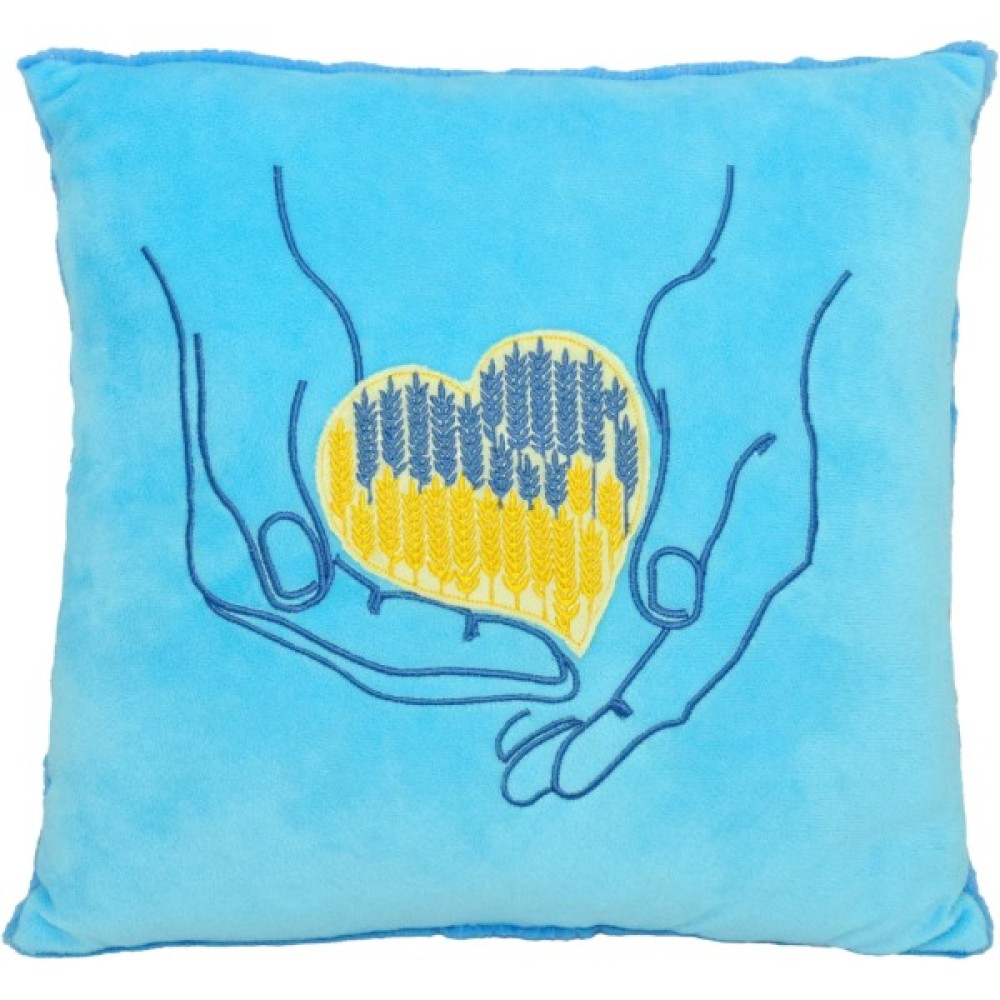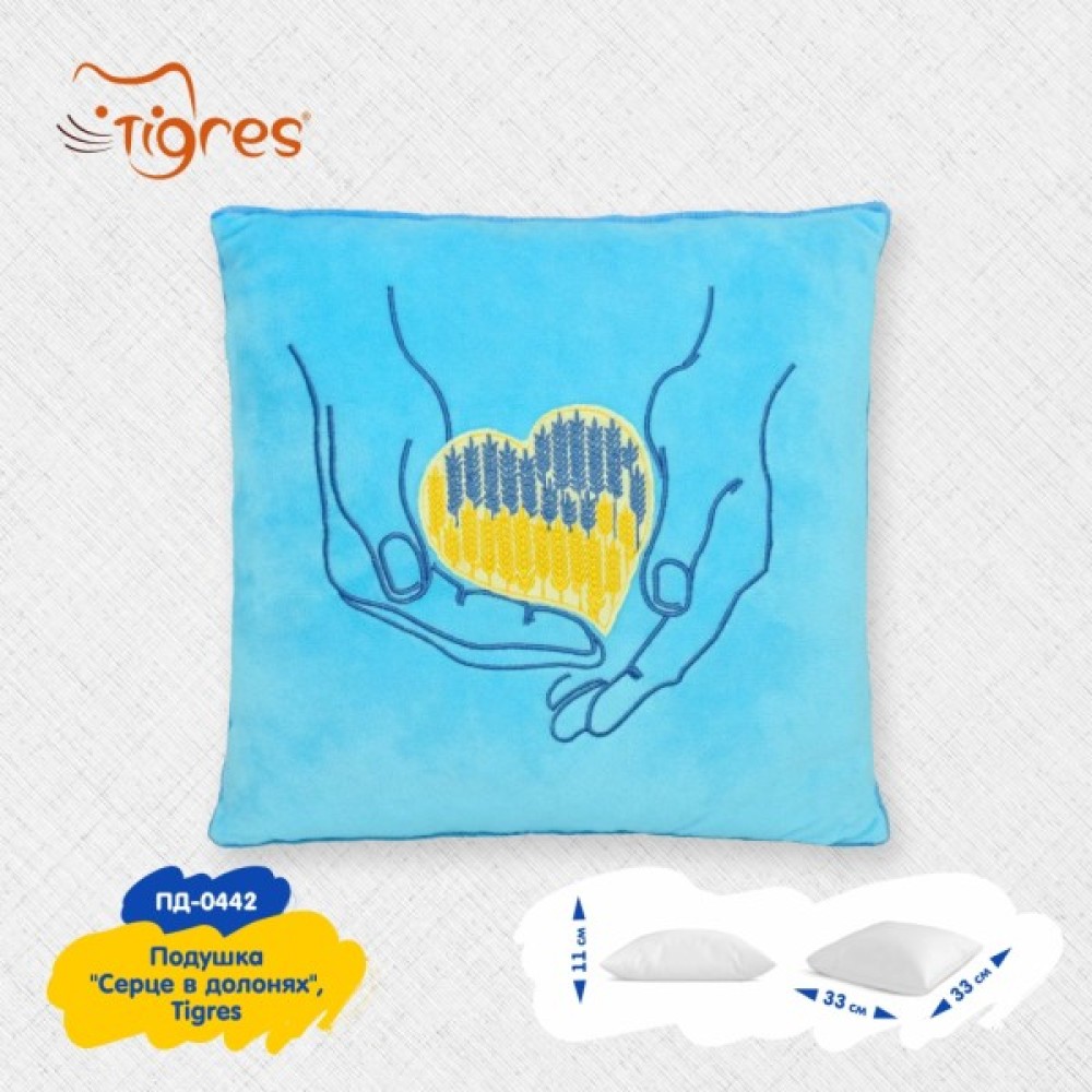Подушка "Серце в долонях", Tigres - дизайнерська подушка, яка гармонійно пасуватиме до інтер’єру вашого дому. Подушка містить елементи національних кольорів й буде ідеальним патріотичним подарунком. Гарний аксесуар для офісу й практичний для авто. Ідеальний сувенір на згадку про Україну. Серія стильних подушок з національною символікою, створена дизайнерами українського бренду, щоб виховувати любов до України у найменших та дарувати атмосферу домашнього затишку.