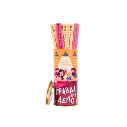 Опис: «Правда або Дія: для веселої компанії» ― гра, яка розворушить будь-яку вечірку! Думаєте, як повеселитися з друзями в барі або вдома? Набридло просто пити пиво й обговорювати одні й ті ж самі теми? Зіграйте в нашу гру, і ви гарантовано надовго запам'ятаєте цей вечір! Вибираючи «Правду», ви маєте чесно відповісти на одне з каверзних запитань. А вибравши «Дію», доведеться виконати умови завдання. Але не бійтеся: все зроблено так, щоб усім було весело. Спробуйте!