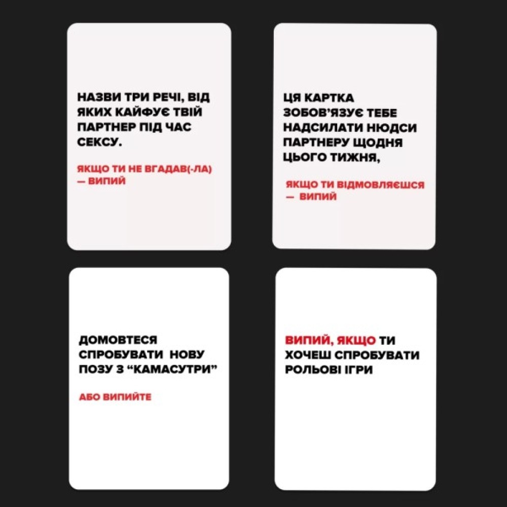 (Не) п'яні кохані (укр.): Занурення в інтимну подорож Насичені вечори, просочені щирими розмовами і доторками, що хвилюють, - це не мрія, а реальність з грою (Не) п'яні кохані. Приєднуйтесь до подорожі, де кожна картка стає мостом до нових переживань та дивовижних відкриттів. Ця гра - не просто набір карт і правил, це мистецтво, покликане проникнути в глибини вашого емоційного світу. Відкривайте потаємні фантазії, ділитесь прихованими бажаннями і знаходьте нові грані пристрасті в обіймах вашого коханого. Дозвольте грі (Не) п'яні кохані (укр.) стати вашим провідником у світі сексуальної відкритості та експериментів. Вона стане чудовим компаньйоном у вашому шляху до глибокої інтимності. Відкривайте сексуальні бажання та пристрасті, ділитесь своїми фантазіями та секретами. Гарячі завдання та провокаційні питання будуть вашими компасами в океані пристрасті, спрямовуючи до неймовірних відкриттів один про одного. Стрімке занурення в ігрову реальність Це не просто гра, це ритуал, покликаний поєднати вас з вашим партнером на новому, глибшому рівні. Пориньте в атмосферу спокуси та розпусти, залиште за дверима повсякденність і дозвольте собі відкритися один одному настільки, наскільки ви ніколи не сміли. Створіть затишний простір! Знайдіть ідеальне укриття, де ви можете бути собою та відкритися один одному без сором'язливості. Перемішайте картки! Пориньте у світ різноманітності, вибираючи випадкові питання та завдання або змішуючи всі картки для збільшення несподіванки. Почніть подорож! Пориньте у розмови, відкривайте свої серця та насолоджуйтесь подорожжю з пікантних питань та інтригуючих завдань. Підготуйтеся до ночі, повної хвилюючих відкриттів, насиченої викликами та можливостями, де кожен шепіт і погляд сповнені сенсу та пристрасті. Відкрийте для себе нові грані кохання та пристрасті! Насолоджуйтеся взаємним дослідженням, будучи впевненими, що кожен момент цієї гри - крок до глибшого розуміння та яскравіших переживань. (Не) п'яні кохані (укр.) - це не просто гра, це ключ до нових рівнів близькості та взаєморозуміння, який ви зможете повернути знову і знову, поринаючи в океан кохання та пристрасті. Для того щоб ваше полум'я кохання продовжувало горіти яскраво, рекомендуємо звернути увагу також на настільні ігри Пожежа та Loopy: sex game. Насміліться разом з настільною грою (Не) п'яні кохані відкрити нові грані своїх почуттів та емоцій. Пориньте у світ інтимних відкриттів, який буде з вами не лише цієї ночі, а й у всіх ваших майбутніх пригодах разом.