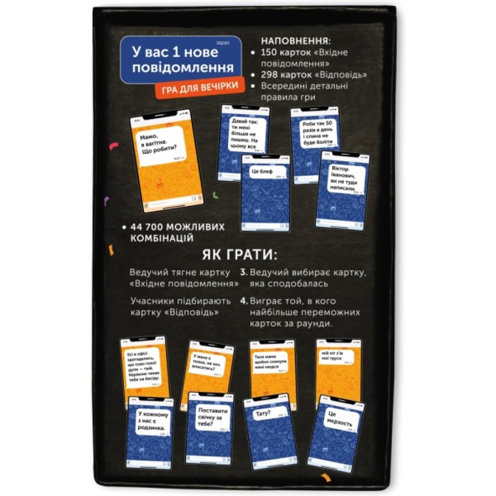 Комплектація 150 карток «вхідне повідомлення»298 карток «відповідь»44700 можливих комбінацій інструкція: на коробцікількість гравців: від 2-хвік: 18+