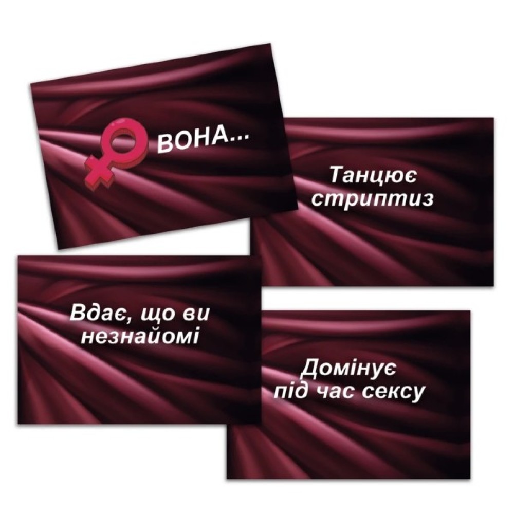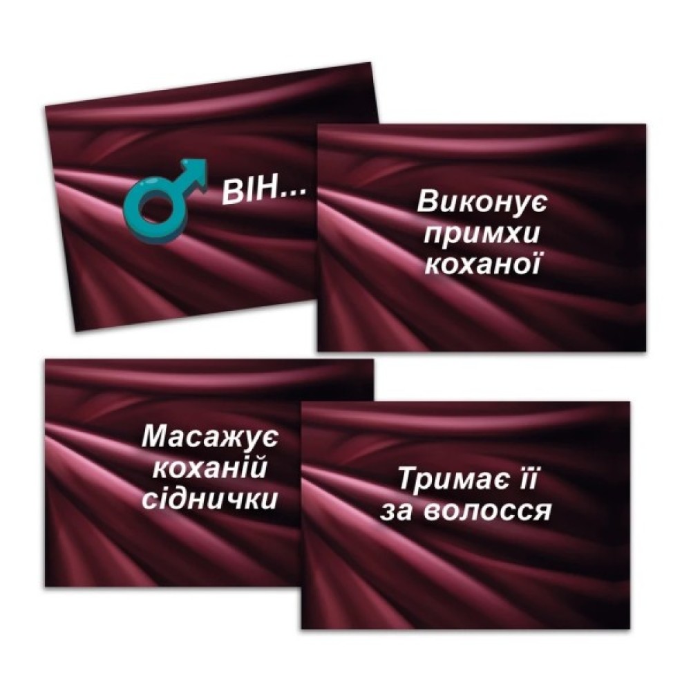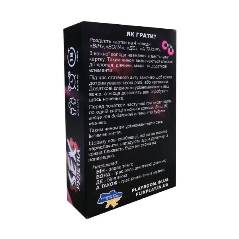 Справжня "SEX-рулетка" для пари, настільна гра для двох, в якій більше 50 000 варіантів розвитку подій! Кожна гра - щось нове, та не схожа на попередній сюжет. Гра містить чотири категорії карток: "ВІН", "ВОНА", "ДЕ", "А ТАКОЖ". В кожній категорії від 13 до 17 варіантів, для поєднання у загальну картину.