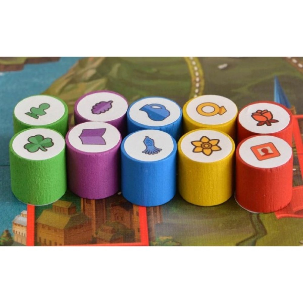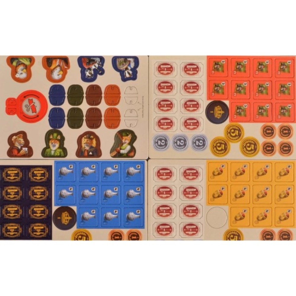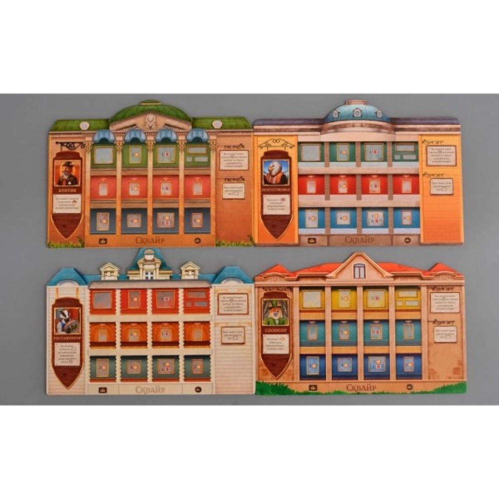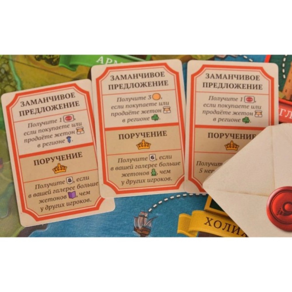 Комплектація двостороннє ігрове поле 55 жетонів експонатів (по 11 кожного кольору) 50 звичайних монет 42 картки послань 30 звичайних квитків 10 дерев'яних маркерів цін із наклейками 8 королівських квитків 8 фішок персонажів 4 планшети гравців 4 королівські монети 4 карти-підказки ринок (необхідно зібрати перед першою партією) жетон виставки правила гри