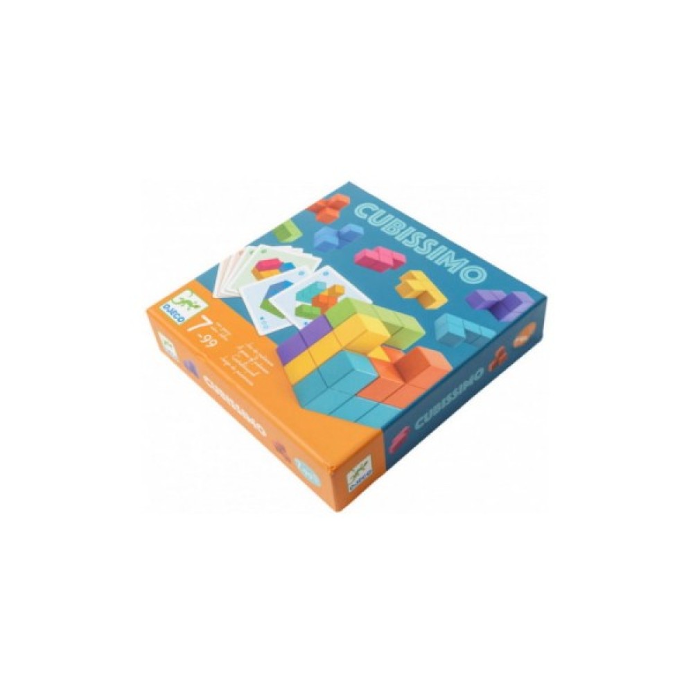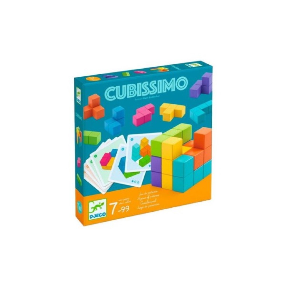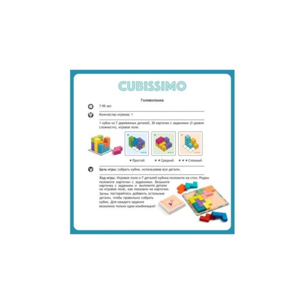 Граючи в Кубіссімо, ви зможете насолоджуватися годинам розумових викликів, адже гра створена для одного учасника, але чудово задовольнить азартний дух і інших шанувальників таких розваг. У комплекті ви знайдете 7 дерев'яних деталей, які потрібно зібрати у ідеальний куб. Це завдання ускладнюється завдяки 30 карткам із завданнями, які пропонують різні стартові позиції.