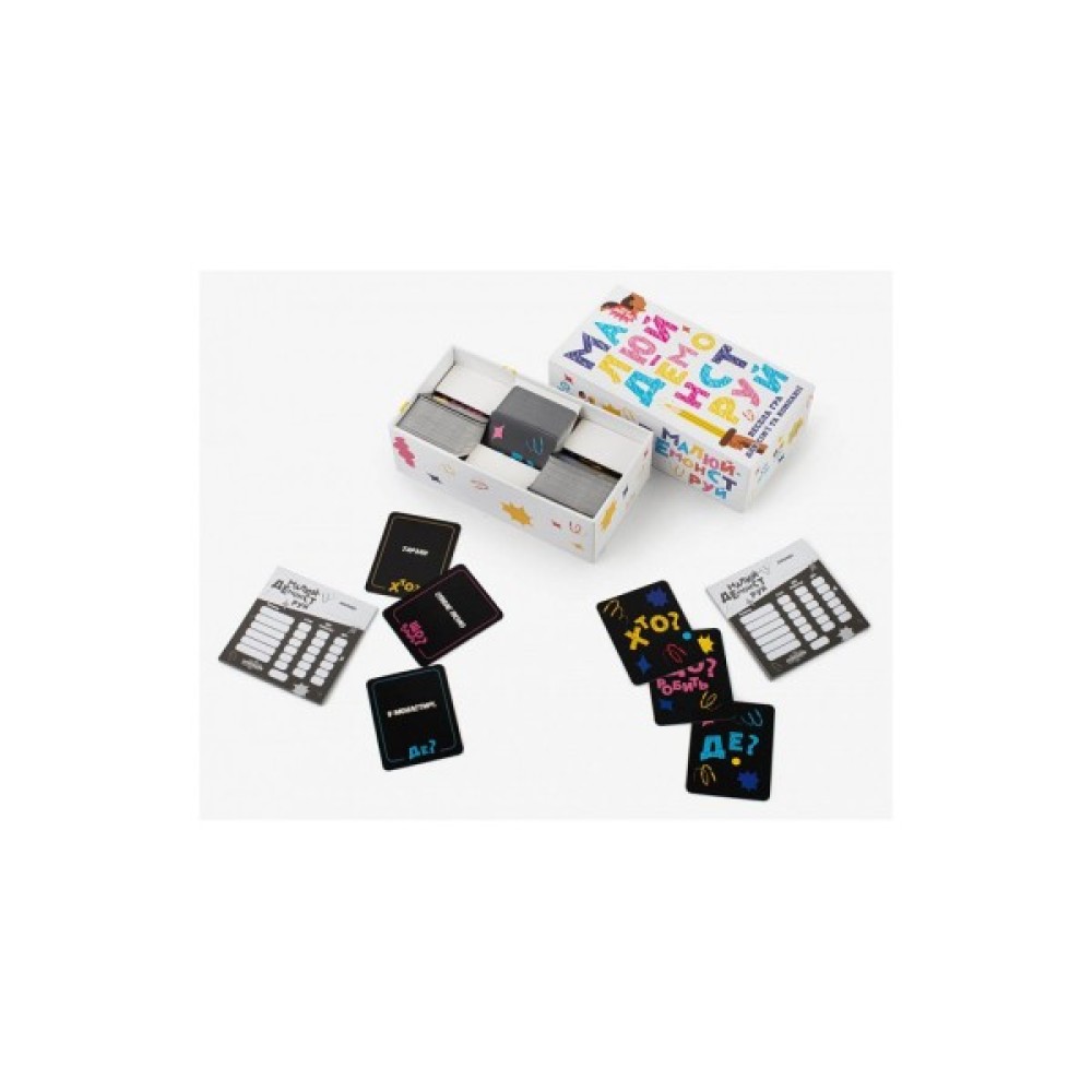 Ця карткова гра розроблена спеціально для тих, хто любить весело і активно проводити час в колі близьких. Завдяки трьом унікальним колодам — «Хто?», «Що робить?» та «Де?» — гра відкриває безмежні горизонти для вашої уяви. Спробуйте зобразити сцену, в якій «Чарівник малює мурал у зоопарку», і при цьому залучити всю свою команду до активної співпраці для розгадання цієї загадки.