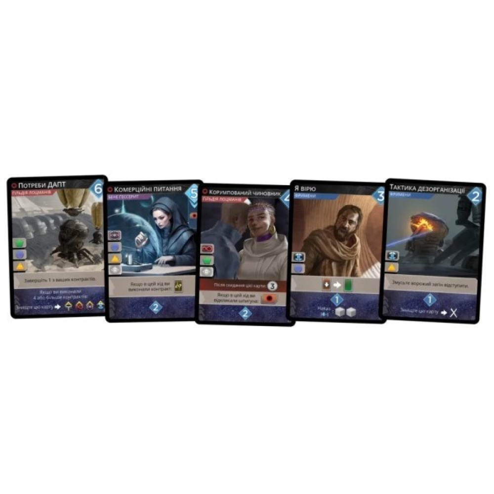 Комплектація гри вражає: поле іксіанського посольства, 86 карт, 18 плиток технологій, 14 умінь сардаукарських офіцерів та набір з 9 лідерів з унікальними здібностями. Ви зможете стати частиною альянсів, укладати контракти і використовувати нові можливості для досягнення переваги.