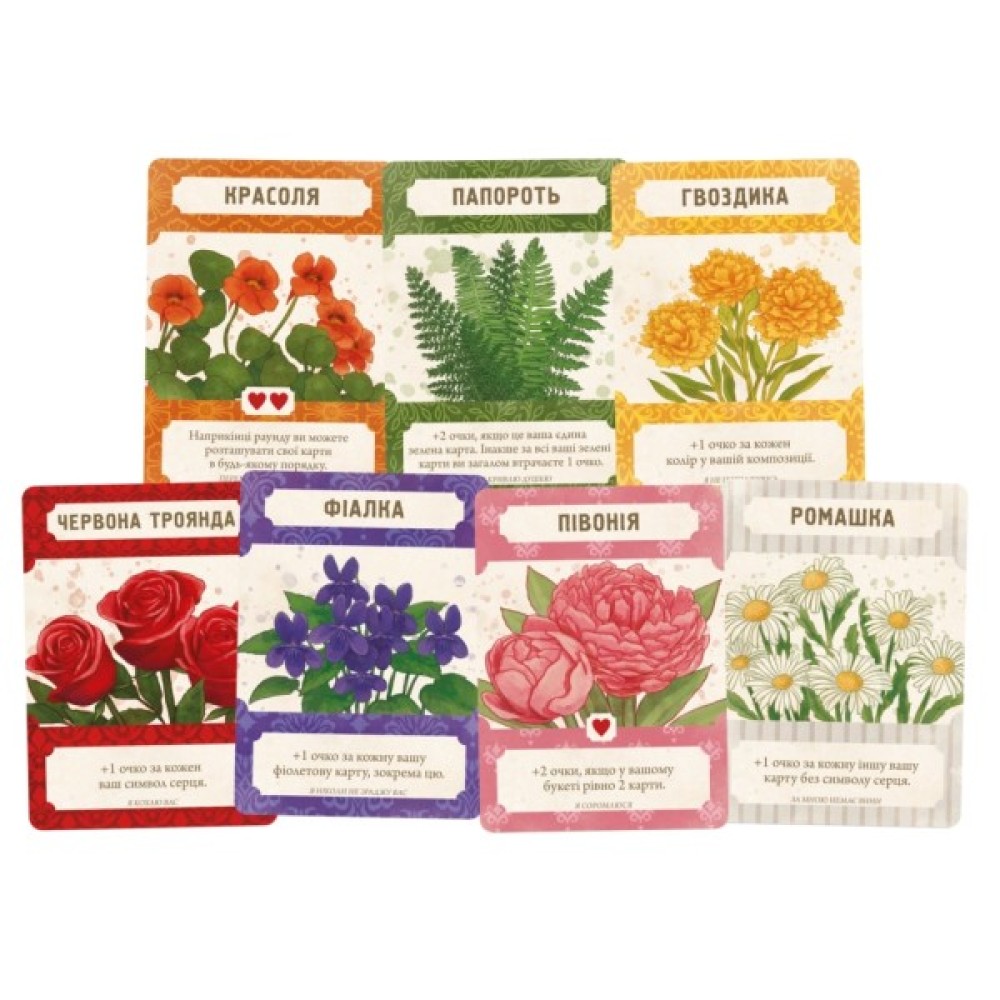 Головна мета гравців – створити найкрасивіший букет, який розкриє справжній характер почуттів. У грі ви знайдете 18 карт квітів, доповнення з помаранчевими квітами, зеленню та стрічками для урізноманітнення композицій. Кожен учасник здатен відчути себе флористом, обираючи або даруючи квіти, які потрібно розмістити так, щоб вони принесли максимальну кількість переможних очок.