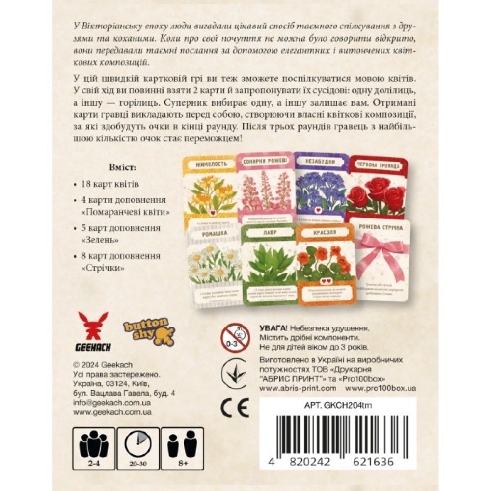 Настільна гра Geekach Games "Мова квітів. Повне видання" (Tussie Mussie) - це чарівна карткова гра для всієї родини, яка перенесе вас у світ ніжних почуттів та флористичних мистецтв. Пориньте в атмосферу середньовічних традицій, коли за допомогою квітів закохані передавали свої емоційні послання. Ця гра для 2-4 гравців стане чудовою розвагою вечорами, адже вона підходить для дітей від 8 років.