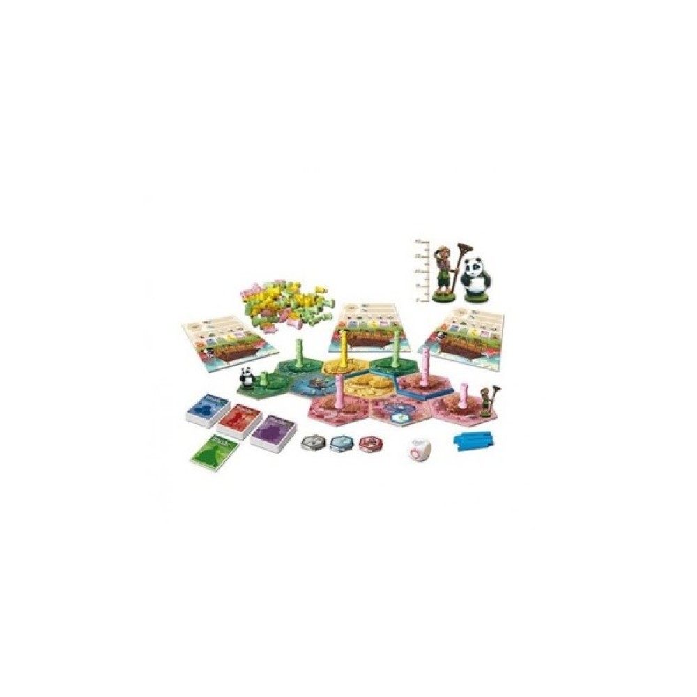 Комплектація 28 плиток ділянок, 28 сегментів зеленого бамбука, 26 сегментів жовтого бамбука, 24 сегменти рожевого бамбука, 20 зрошувальних каналів, 9 жетонів покращень, 46 карт завдань, 4 планшети гравців, 8 фішок дій, 1 кубик погоди, 1 фігурка панди, 1 фігурка садівника, 1 книжечка правил