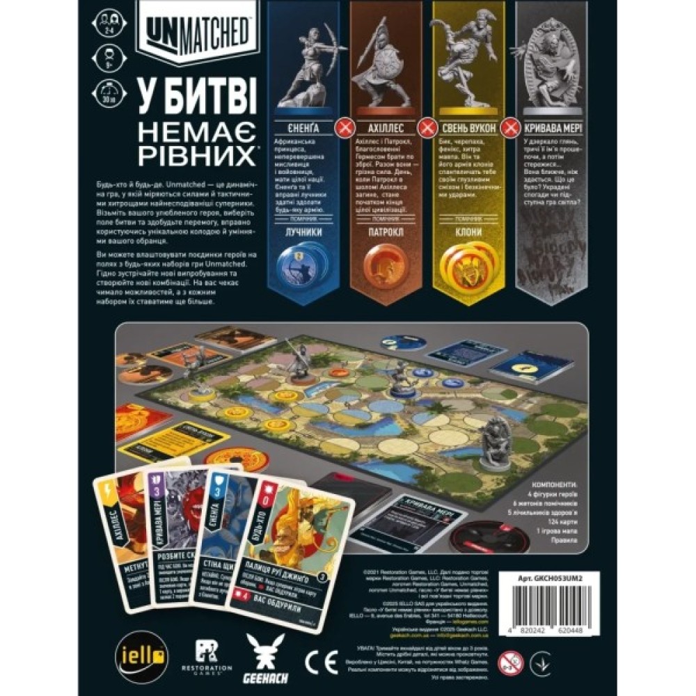 Настільна гра Geekach Games Unmatched: Битва легенд. Частина друга (укр.) – це чудовий вибір для шанувальників фентезі та захопливих змагальних ігор. Ідеальна для всієї родини та дітей від 9 років, вона об'єднує 2-4 гравців у битві на епічному полі бою. Родзинкою цього набору є 4 мініатюри героїв із різних епох і всесвітів, таких як давньогрецький Ахіллес і китайський цар мавп.