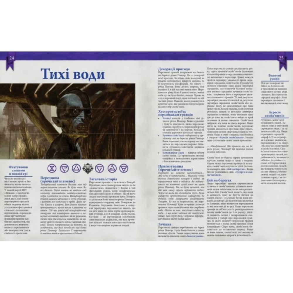 Компактний буклет на 32 сторінки містить все, що потрібно, щоб швидко освоїти основи гри: від стратегії ведення сюжету до базових правил поведінки гравців. Крім того, в комплекті передбачено 6 аркушів із готовими персонажами, що дозволяє відразу ж приступити до гри.