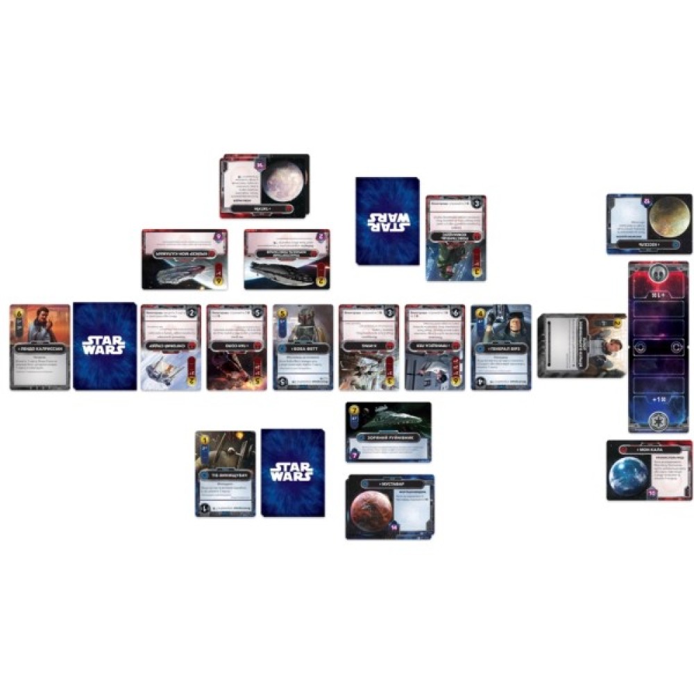 У комплекті ви знайдете 10 початкових карт Імперії, 10 початкових карт Повстанців, 90 карт галактики і 10 карт пілотів Зовнішнього кільця. Також гра включає 20 карт баз, 50 жетонів пошкоджень, 20 жетонів ресурсів, трек Сили та інші елементи, які допоможуть вам створити унікальну і неповторну стратегію.