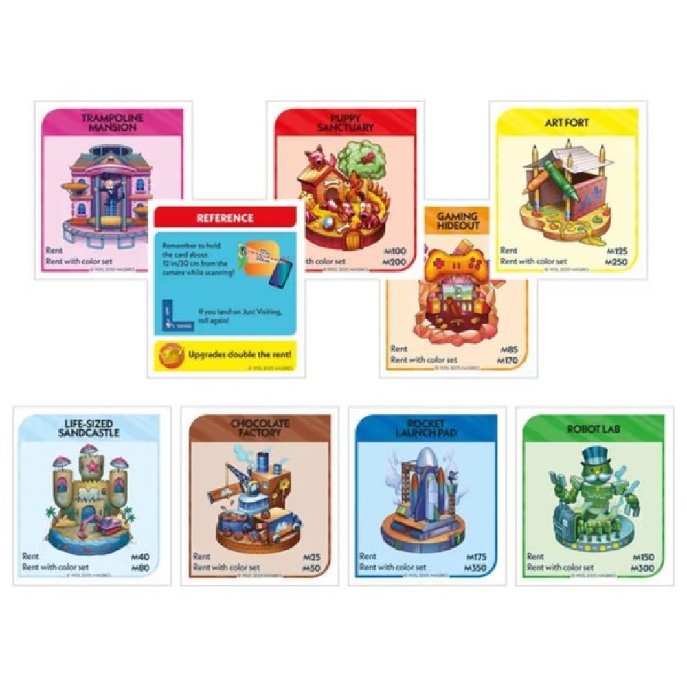 <б>Цей ігровий набір включає: ігрове поле, 2 гральні кубики, пластикову підставку для пристроїв, 6 жетонів, 6 банківських карток, 6 пластикових корон покращень, 22 картки права власності, 2 довідкові картки і 6 карток дій. Замість традиційного підрахунку гравці можуть сканувати документи про право власності, миттєво купувати, виставляти на аукціон та збирати орендну плату за допомогою програми. Додаток також пропонує міні-ігри, які дозволяють отримувати бонуси, роблячи гру ще динамічнішою.