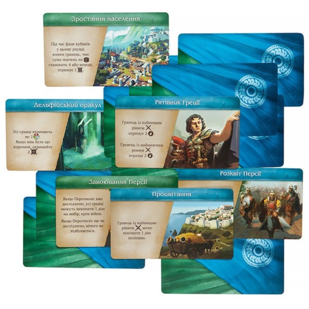 В арсеналі кожного міста унікальні здібності і стратегії, що дозволяють гравцям відчути себе творцем історії. Висока якість компонентів — ігрове поле, 40 карт політики, 16 карт подій та інші елементи, зокрема, жетони знань, філософії, золота і срібла — створюють атмосферу динамічного розвитку міст, прокладаючи шлях до величі.