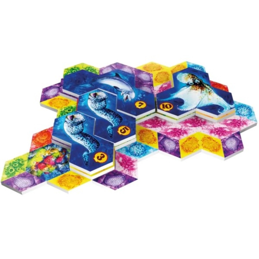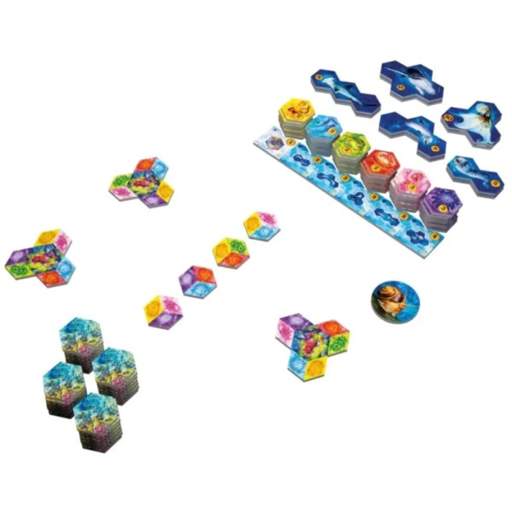 Гра включає 70 плиток коралів, 72 плитки малих тварин і 15 плиток великих. Також ви знайдете 24 жетони екосистем, жетон морського равлика, 4 плитки осередків і блокнот для підрахунку балів. Яскравий дизайн компонентів не лише прикрашає процес, а й робить його максимально захопливим.